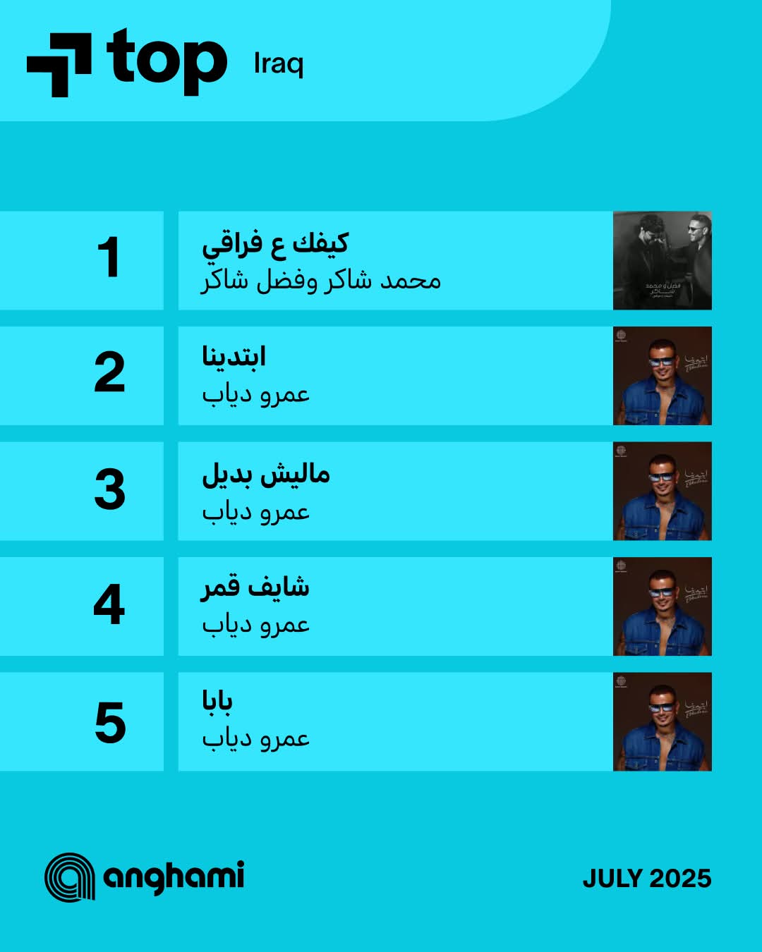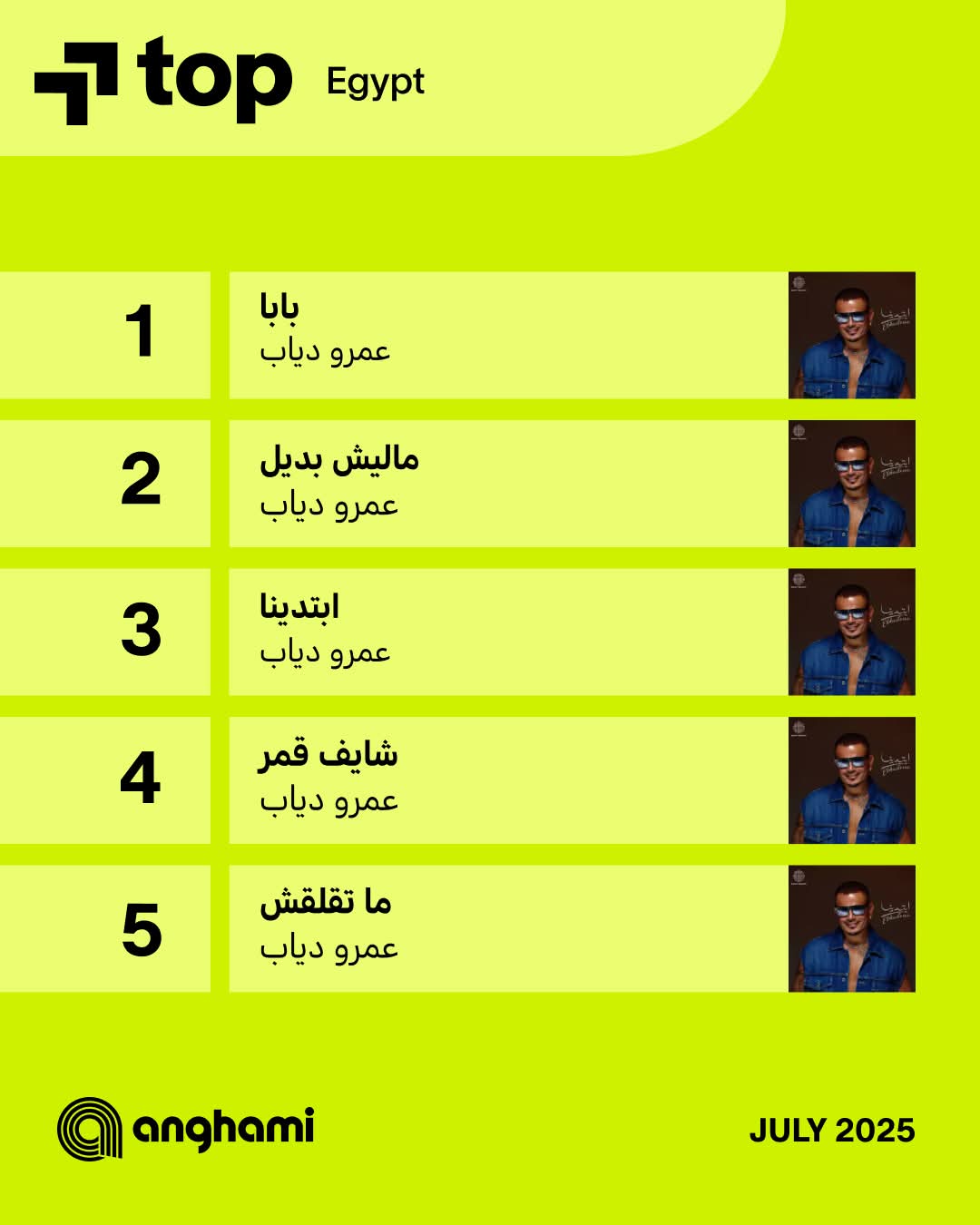 الهضبة عمرو دياب الأعلى استماعا فى توب شهر يوليو على أنغامي