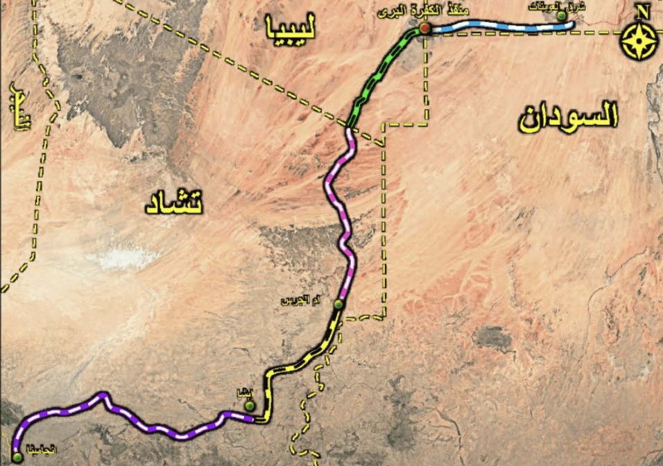 وأوضحت الوزارة أن الطريق ينقسم إلى ثلاثة قطاعات، الأول منها داخل الأراضى المصرية بطول (400) كم، والقطاع الثانى داخل الأراضى الليبية بطول (390) كم، والقطاع الثالث من الحدود التشادية حتى إبشا مروراً بمدينة أم الجرس بطول (930) كم.