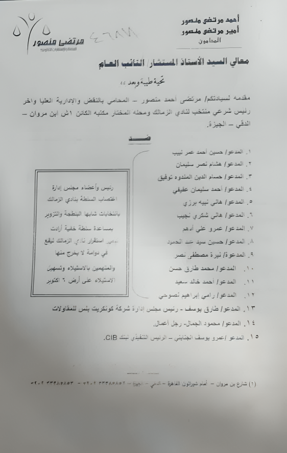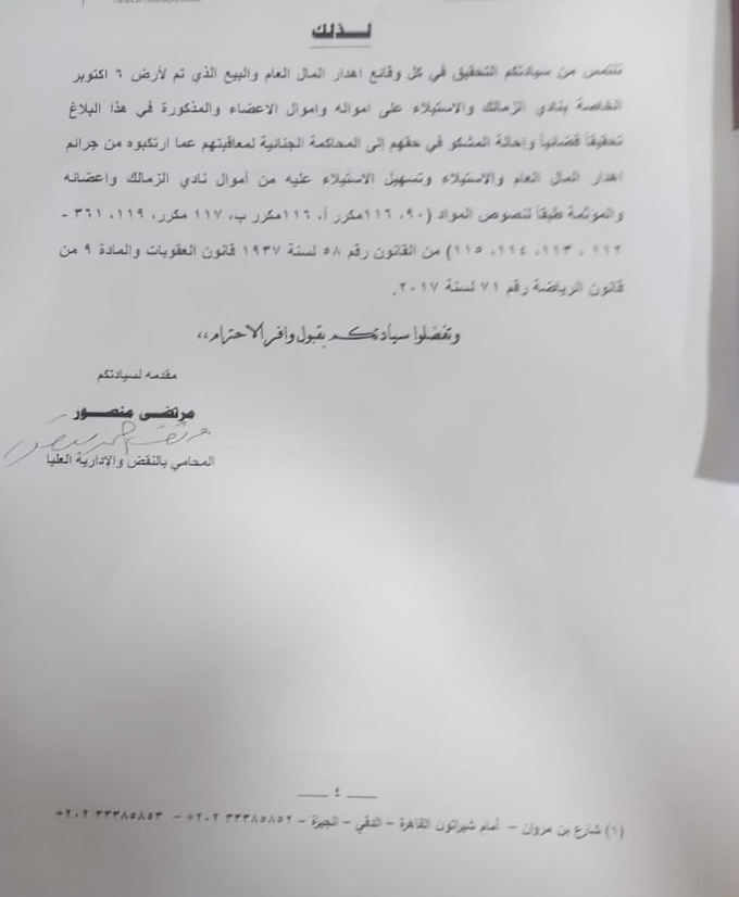 من جانبه، قدم المستشار مرتضى منصور، رئيس نادي الزمالك السابق، بلاغا إلى النائب العام، طالب فيه بالتحقيق في سحب أرض نادي الزمالك في حدائق أكتوبر، واصفا الواقعة بالخطيرة والتي تتعلق بإهدار المال العام والاستيلاء على أراضي وأموال تخص نادي الزمالك وأعضائه.