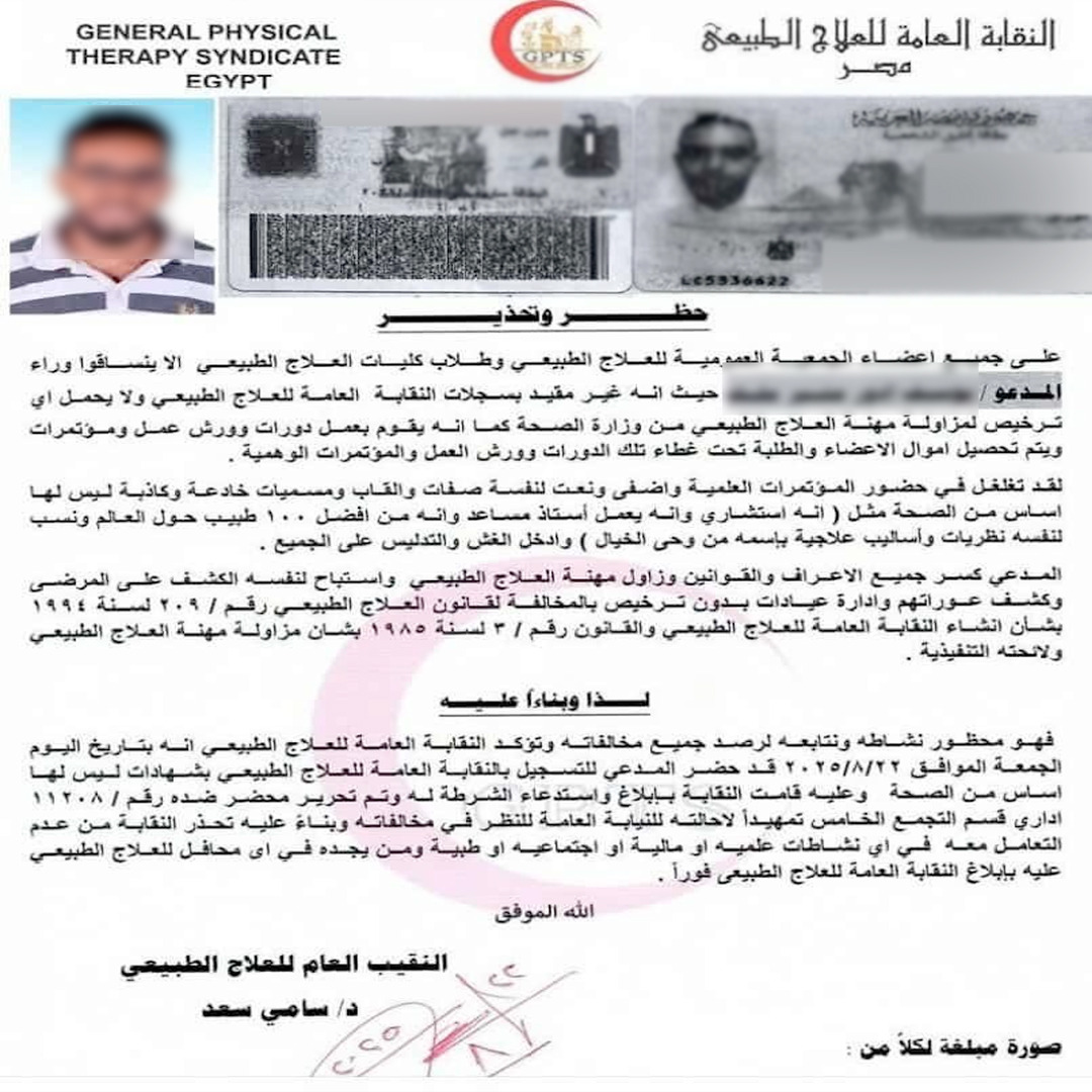 وكشفت التحقيقات الأولية بالنقابة أن يوسف إدوار لم يكن مقيدًا بسجلات النقابة العامة للعلاج الطبيعي، ولا يحمل أي ترخيص لمزاولة المهنة من وزارة الصحة، في مخالفة واضحة لقانون العلاج الطبيعي رقم 209 لسنة 1994، وقانون مزاولة المهنة رقم 3 لسنة 1985 ورغم ذلك، استطاع المتهم خداع العديد من الأشخاص على مدار سنوات، مدعيًا أنه أخصائي علاج طبيعي وتغذية علاجية، ومارس الكشف الطبي على المرضى كونه منتحلا صفة طبيب، بما في ذلك فئات من المجتمع الراقي، وأدار عيادات بدون ترخيص٬ أكدت نقابة العلاج الطبيعي في بيانها أن يوسف إدوار ليس عضوًا في النقابة، ولا يحق له مزاولة المهنة بأي شكل٬ وحذرت النقابة من التعامل معه أو مع أي شخص يدعي مزاولة المهنة دون ترخيص، مشددة على أهمية التحقق من المؤهلات والتراخيص قبل الخضوع لأي علاج. وأشارت إلى أن المتهم كسر جميع الأعراف والقوانين، واستباح خصوصية المرضى من خلال الكشف عليهم وإدارة عيادات غير مرخصة"