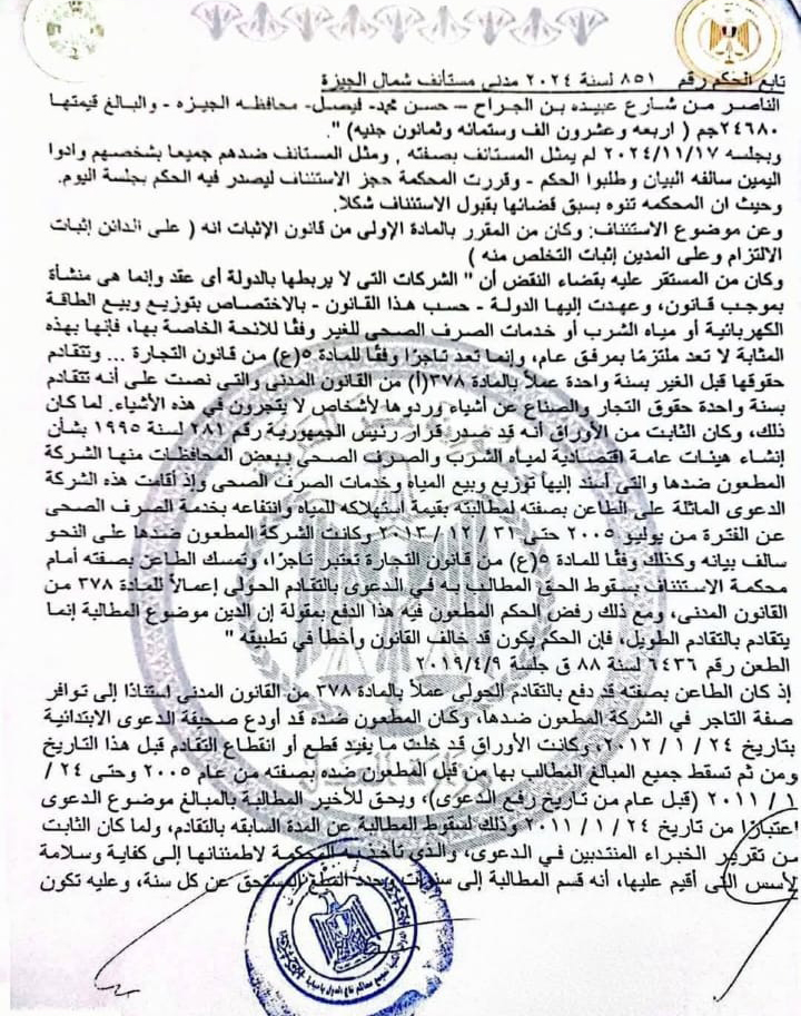 ويقضي الحكم المستأنف فى القضية رقم 851 لسنة 2024 مدنى مستأنف شمال الجيزة، بتأيد حكم اول درجة بسقوط حق شركة المياه بمطالبة شخص بقيمة 24680 جنيه بعدد 89 فاتورة مياه تأسيسا علي التقادم الحولي بالمادة 378 من القانون المدني .