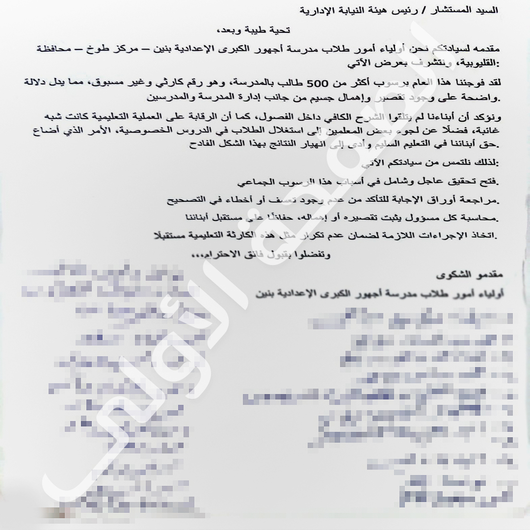 وأكد أولياء الأمور في الشكوي المقدمة أن رسوب أولادهم كارثة تعليمية وأكدوا علي أن أبناءهم لم يتلقوا الشرح الكافي داخل الفصول، كما أن الرقابة على العملية التعليمية كانت شبه غائبة، فضلاً عن لجوء بعض المعلمين إلى استغلال الطلاب في الدروس الخصوصية، الأمر الذي أضاع حق أبنائنا في التعليم السليم وأدى إلى انهيار النتائج بهذا الشكل الفادح.