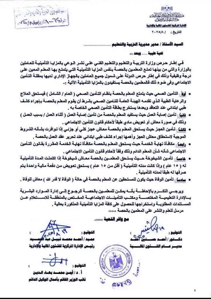 وصدر عن الإدارة المركزية للشئون المالية والإدارية في وزارة التعليم، الخطاب الرسمي رقم 10062 بتاريخ 25 أغسطس 2025، وجهته للمديريات التعليمية في المحافظات، دعت فيه إلى توعية المعلمين والعاملين بالمزايا التأمينية التي يتمتعون بها، مع التركيز على معلمي الحصة، قائلة إن لهم نفس المزايا التأمينية للمعلمين المعينين على درجات وظيفية، في ظل توجه الحكومة لضم جميع العاملين في الجهاز الإداري تحت مظلة التأمين الاجتماعي.
