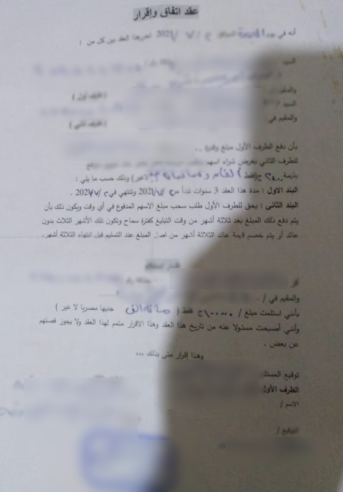 ورغم توقيع المتهم لعقود اتفاق مع ضحاياه على شراء «أسهم» بمكتب للنقل يمتلكه، وفقا لمهنته ببطاقة الرقم القومى المدون فيها « صاحب مكتب (...) للنقل والمقاولات» مقابل عائد شهرى إلا أنه يرفض فيما بعد تسديد هذا العائد.