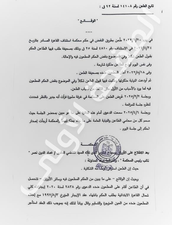 وقالت محكمة النقض في حكمها: إنه في يوم 20 يونيو 2022، طعن بطريق النقض في حكم محكمة استئناف القاهرة الصادر بتاريخ 24 أبريل 2022، في الاستئناف رقم 4810 لسنة 25 ق وذلك بصحيفة طلب فيها الطاعن الحكم بقبول الطعن شكلاً وفي الموضوع بنقض الحكم المطعون فيه والإحالة.