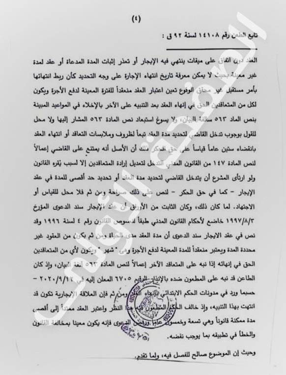 أصدرت محكمة النقض حكما تاريخيا، باعتبار عدم النص على مدة عقد الإيجار الخاضع للقانون المدني "بالقانون 4 لسنة 1996"، يمثل اتفاقا على أن العقد مدته شهر واحد فقط، حتى وإن كتب في العقد أن مدته مدى الحياة، ولا يجوز اعتبارها 59 عاما، كما تنص بعض الأحكام الابتدائية.