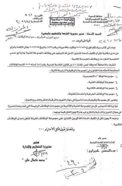 وقال نص الرد : إيماء إلى الكتاب المؤرخ فى 2025/2/22 والمقيد بالمديرية برقم (157) بتاريخ 2025/2/28 بشأن الإفادة بالرأي عن مدى إمكانية نقل أو تكليف السادة المثبتين الذين تم تثبيتهم على وظائف المجموعة الفنية بإدارة ابو حمص التعليمية لشغل إحدى وظائف المجموعة المكتبية.