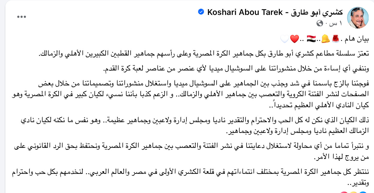 وقالت مطاعم كشري أبوطارق فى بيان لها: فوجئنا بالزج باسمنا في شد وجذب بين الجماهير على السوشيال ميديا واستغلال منشوراتنا وتصميماتنا من خلال بعض الصفحات لنشر الفتنة الكروية والتعصب بين جماهير الأهلي والزمالك، و الزعم كذبا بأننا نسيء لكيان كبير في الكرة المصرية وهو كيان النادي الأهلي العظيم تحديداً، ذلك الكيان الذي نكن له كل الحب والاحترام والتقدير ناديا ومجلس إدارة ولاعبين وجماهير عظيمة، وهو نفس ما نكنه لكيان نادي الزمالك العظيم ناديا ومجلس إدارة ولاعبين وجماهير.