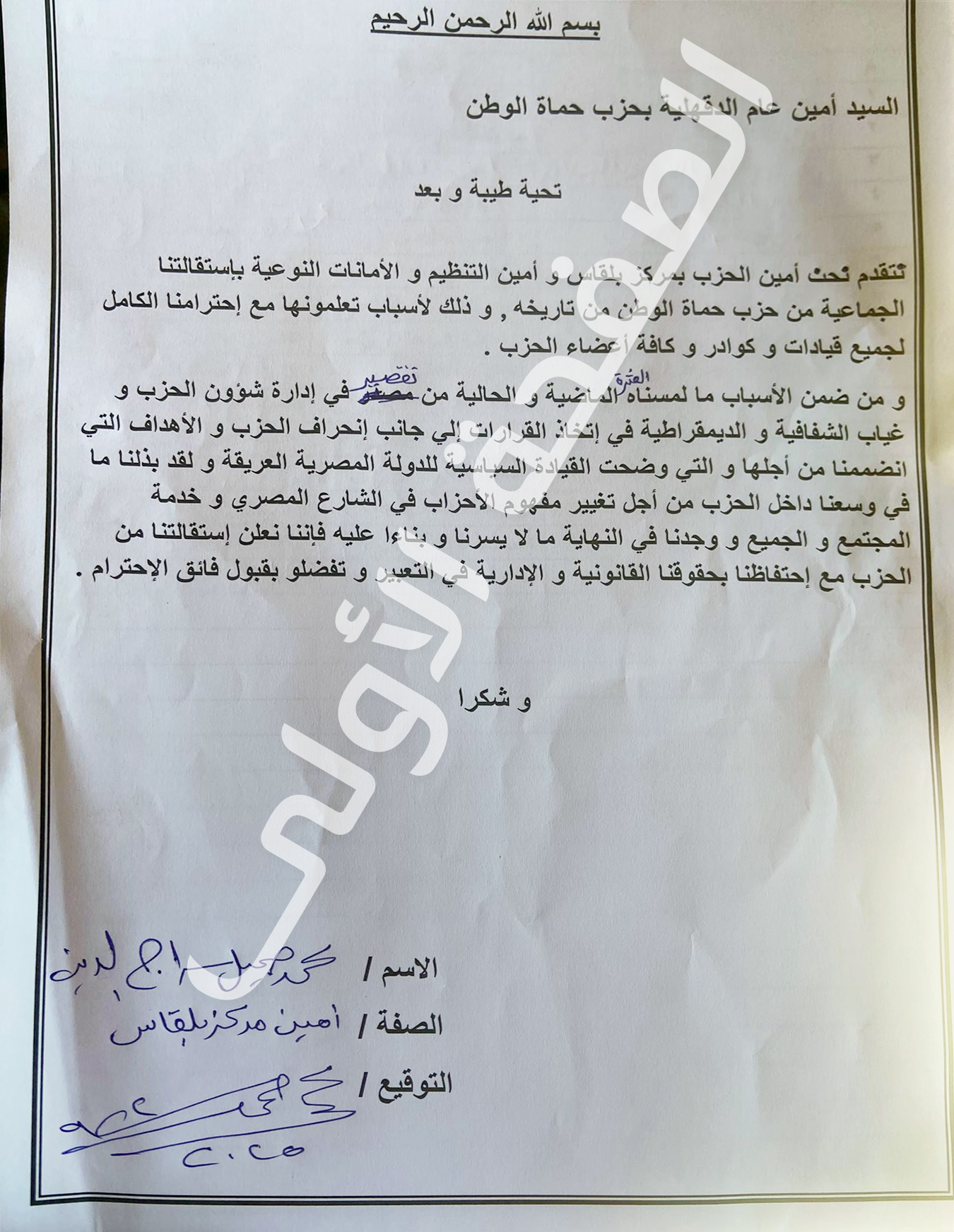 ووقع على الاستقالة الجماعية كل من، أسامة محمود علي، أمين تنظيم الحزب، ومحمد حسن جبر، مساعد أمين التنظيم، ومحمد عبد العزيز البدراوي، أمين العمل الجماهيري، وعبد الحكيم محمد، أمين المهنيين، ومحمد جمال الدين، امين العمال، وكرم لطفي سعيد، ومحمد جميل سراج الدين، أمين مركز بلقاس، ووهاني أبو الخير، أمين المواطنة، ونوران محمود عبد العزيز، أمين البيئة، وعبد العليم ذكي عبد العليم، أمين الشئون القانونية، وميرهان أشرف رشدي، أمين التنمية البشرية، ومحمد علي عبد الحليم مساعد أمين الحزب، ومحمد أمين شحاتة أمين التكنولوجيا، وفتحي أبو زيد الشؤون الثقافية، وأحمد لطفي عبد الموجود، أمين حقوق الإنسان.