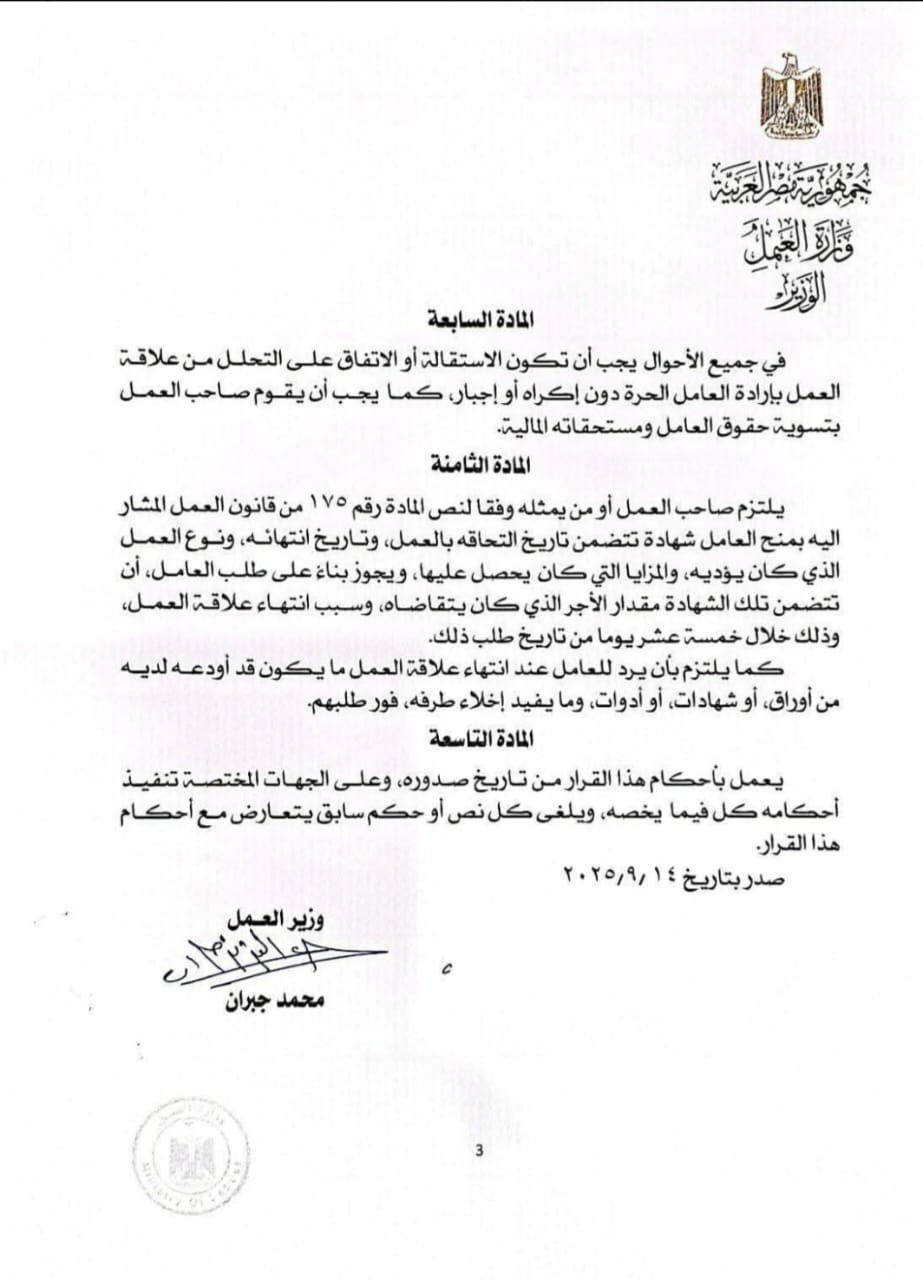 أما المادة السابعة قالت أنه في جميع الأحوال يجب أن تكون الاستقالات أو الاتفاق على التحلل من علاقة العمل بإرادة العامل الحرة دون إكراه أو إجبار، كما يجب أن يقوم صاحب العمل بتسوية حقوق العامل ومستحقاته المالية. كما أشارت المادة الثامنة،على أن يلتزم صاحب العمل أو من يمثله وفقاً لنص المادة رقم 175 من قانون العمل المشار اليه بمنح العامل شهادة تتضمن تاريخ التحاقه بالعمل، وتاريخ انتهائه، ونوع العمل الذي كان يؤديه، والمزايا التي كان يحصل عليها، ويجوز بناءً على طلب العامل، أن تتضمن تلك الشهادة مقدار الأجر الذي كان يتقاضاه، وسبب انتهاء علاقة العمل، وذلك خلال خمسة عشر يوماً من تاريخ طلب ذلك،كما يلتزم بأن يرد للعامل عند انتهاء علاقة العمل ما يكون قد أودعه لديه من أوراق، أو شهادات، أو أدوات، وما يفيد إخلاء طرفه، فور طلبهم، والمادة التاسعة جاء فيها أنه يُعمل بأحكام هذا القرار من تاريخ صدوره، في 14 -9-2025، وعلى الجهات المختصة تنفيذ أحكامه كل فيما يخصه، ويلغى كل نص أو حكم سابق يتعارض مع أحكام هذا القرار.