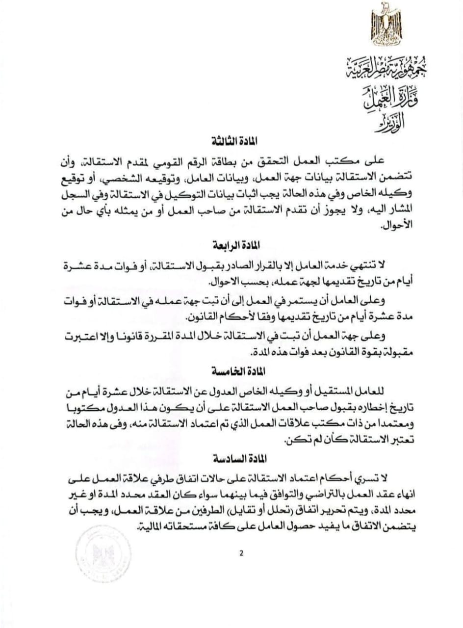 وتضمن القرار، 9 مواد، جاء في المادة الأولى منه: أن يُقدم العامل استقالته كتابة لجهة عمله بشرط أن تكون مُوقعة من العامل أو من وكيله الخاص، ومعتمدة من أحد مكاتب علاقات العمل بمديريات العمل في المحافظات سواء الواقع في دائرة اختصاصه المركز الرئيسي للمنشأة، أو أحد فروعها، أو من مديرية العمل، وعلى مكتب علاقات العمل قيد الاستقالة برقم مسلسل في السجل الالكتروني أو الورقي المُعد لذلك، واعتمادها بخاتم المكتب واثبات تاريخ الاعتماد، ورقم المسلسل على الاستقالة وتسليمها للعامل، وعلى مديرية العمل موافاة الإدارة العامة لعلاقات العمل بديوان عام الوزارة ببيان شهري بأعداد الاستقالات المعتمدة وبياناتها. وجاء في المادة الثانية، أنه يُعتد بخاتم مكتب علاقات العمل في اعتماد الاستقالة لدى جهة العمل وفي المعاملات الرسمية، ويجوز للعامل – بناء على طلبه – أن يطلب اعتماد الاستقالة بخاتم شعار الجمهورية.