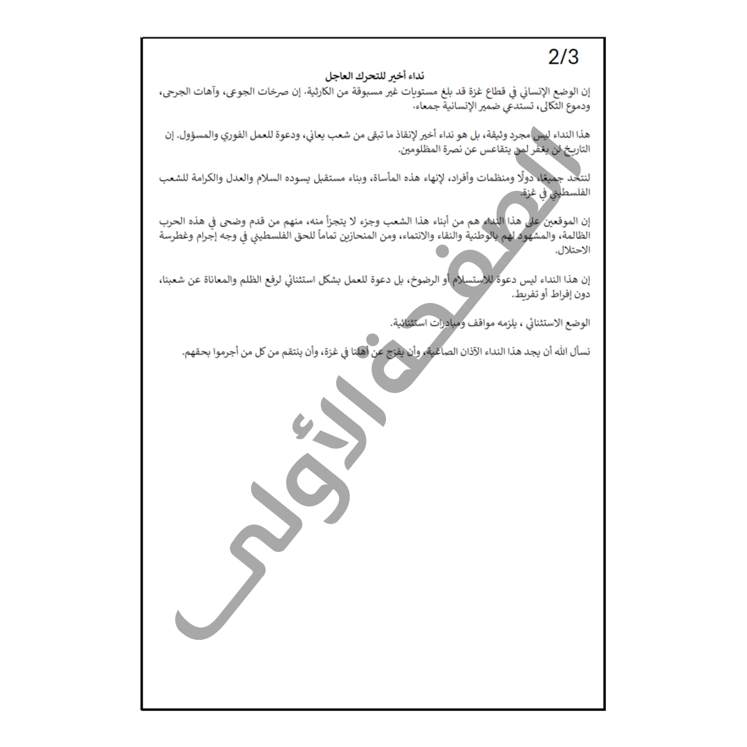 وقال الموقعون على النداء إن الوضع الإنساني في قطاع غزة قد بلغ مستويات غير مسبوقة من الكارثية، كما أن صرخات الجوعى، وآهات الجرحى ودموع الثكالى تستدعي ضمير الإنسانية جمعاء، فهذا النداء ليس مجرد وثيقة، بل هو نداء أخير لإنقاذ ما تبقى من شعب يعاني، ودعوة للعمل الفوري والمسؤول. إن التاريخ لن يغفر لمن يتقاعس عن نصرة المظلومين، مع دعوة للاتحاد جميعا، دولًا ومنظمات وأفراد، لإنهاء هذه المأساة، وبناء مستقبل يسوده السلام والعدل والكرامة للشعب الفلسطيني في غزة.
