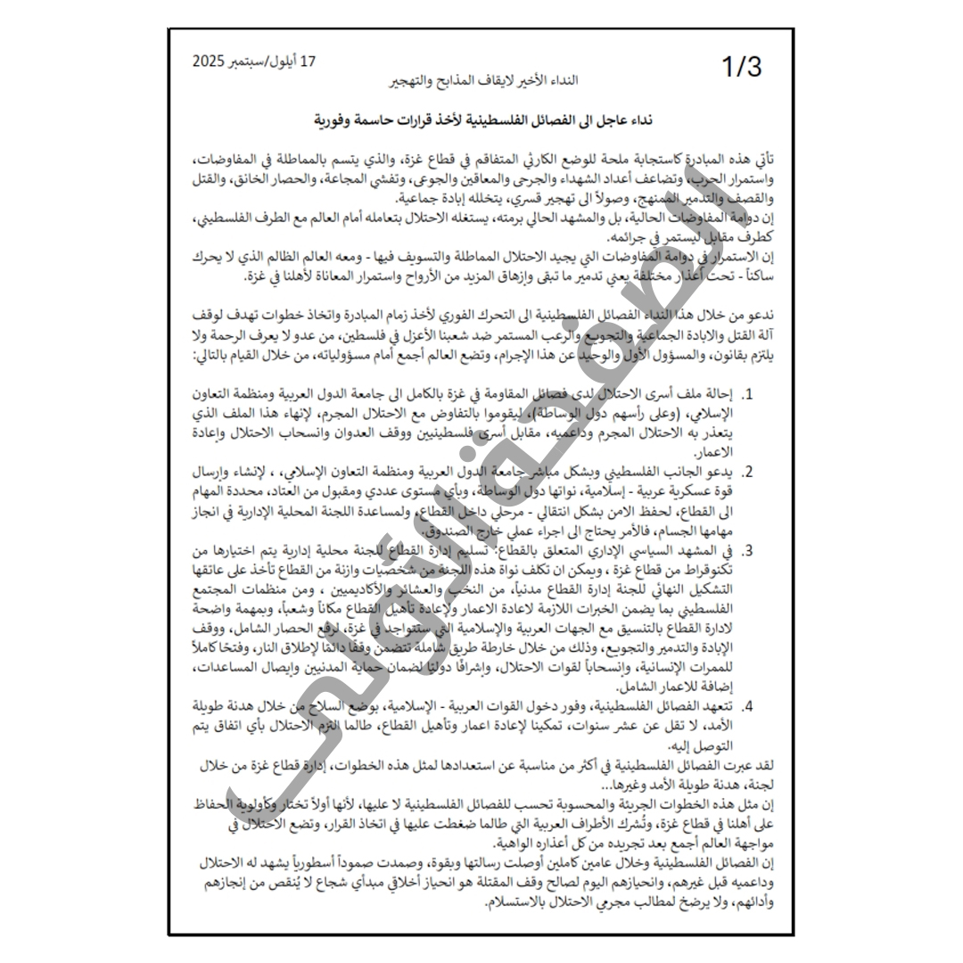 وأـشارت المبادرة إلى أن الفصائل الفلسطينية في أكثر من مناسبة عبرت عن استعدادها لمثل هذه الخطوات إدارة قطاع غزة من خلال لجنة، هدنة طويلة الأمد وغيرها، لإن مثل هذه الخطوات الجريئة والمحسوبة تحسب للفصائل الفلسطينية لا عليها، لأنها أولاً تختار وكأولوية الحفاظ على أهلنا في قطاع غزة، وتُشرك الأطراف العربية التي طالما ضغطت عليها في اتخاذ القرار، وتضع الاحتلال في مواجهة العالم أجمع بعد تجريده من كل أعذاره الواهية إن الفصائل الفلسطينية وخلال عامين كاملين أوصلت رسالتها وبقوة، وصمدت صموداً أسطورياً يشهد له الاحتلال وداعميه قبل غيرهم، وانحيازهم اليوم لصالح وقف المقتلة هو انحياز أخلاقي مبدأي شجاع لا يُنقص من إنجازهم وأدائهم، ولا يرضخ لمطالب مجرمي الاحتلال بالاستسلام.