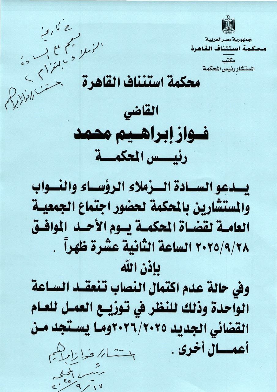 وجه القاضي فواز إبراهيم محمد، رئيس محكمة استئناف القاهرة، الدعوة إلى الرؤساء والنواب والمستشارين بالمحكمة، لحضور اجتماع الجمعية العامة لقضاة المحكمة، يوم الأحد الموافق 28 سبتمبر 2025، في تمام الساعة الثانية عشرة ظهرا.