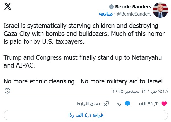 وكتب بيرني ساندرز: «على مدار العامين الماضيين، لم تكتفِ إسرائيل بالدفاع عن نفسها ضد (حماس)، بل شنت حرباً شاملة ضد الشعب الفلسطيني بأكمله».