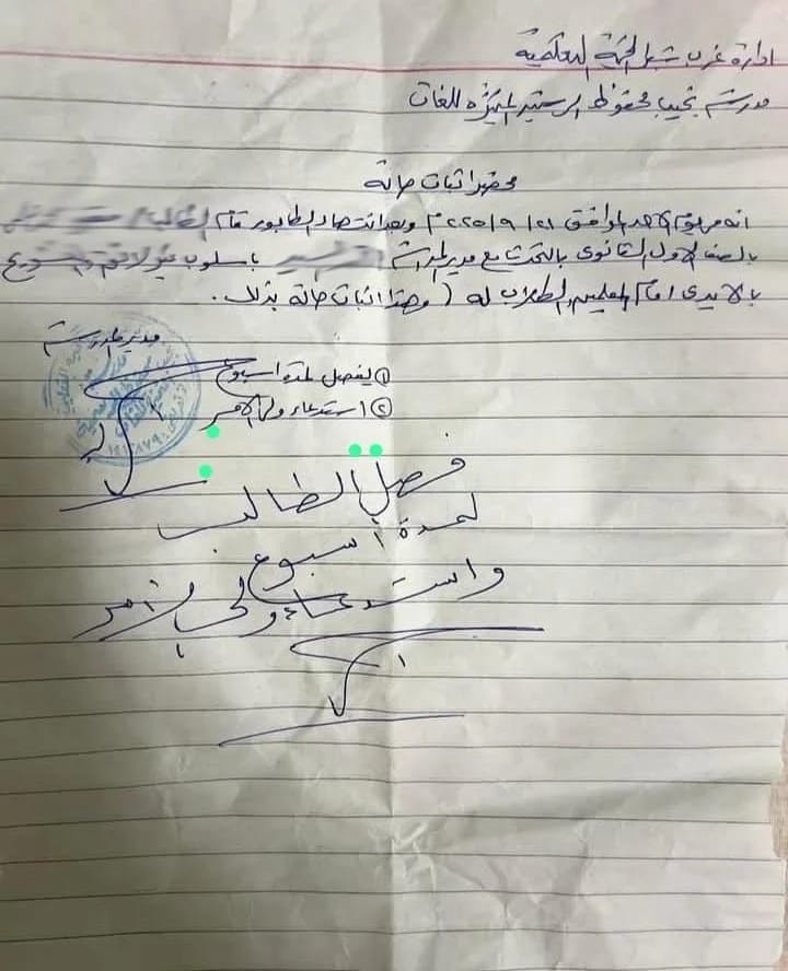 «شوح للمدير» .. فصل طالب بشبرا الخيمة أسبوعاً مع استدعاء ولي أمره