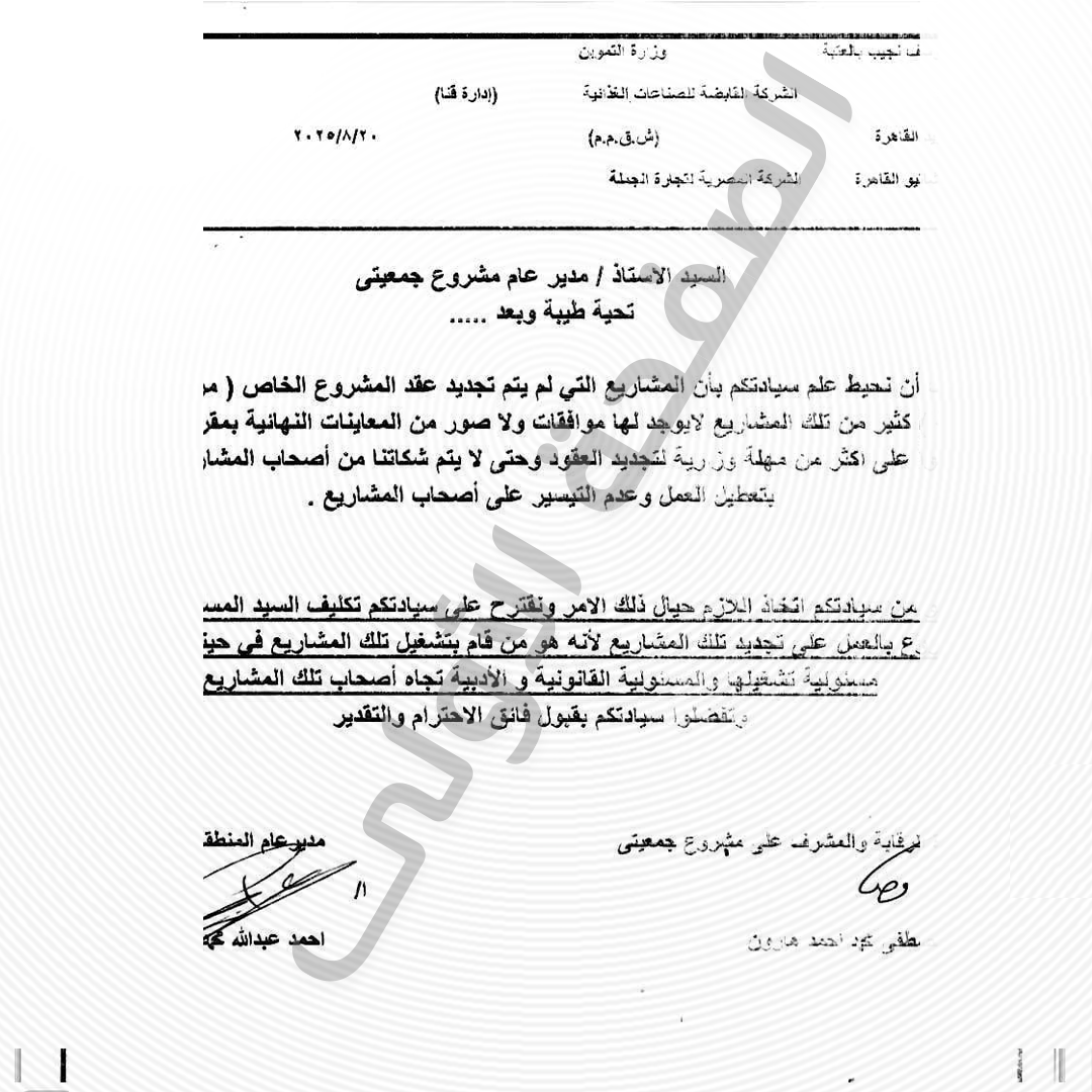 وقال نص الخطاب الموجه من مدير إدارة الرقابة بالشركة المصرية لتجارة الجملة إلى مدير عام مشروع جمعيتي: «نتشرف أن نحيط علم سيادتكم بأن المشاريع التي لم يتم تجديد عقد المشروع الخاص بالمرحلة الثانية والثالثة كثير من تلك المشاريع لا يوجد لها موافقات ولا صور من المعاينات النهائية بمقر المنطقة وقد تحصلوا على أكثر من مهلة وزارية لتجديد العقود وحتى لا يتم شكايتنا من أصحاب المشاريع واتهامنا بتعطيل العمل وعدم التيسير على أصحاب المشاريع .