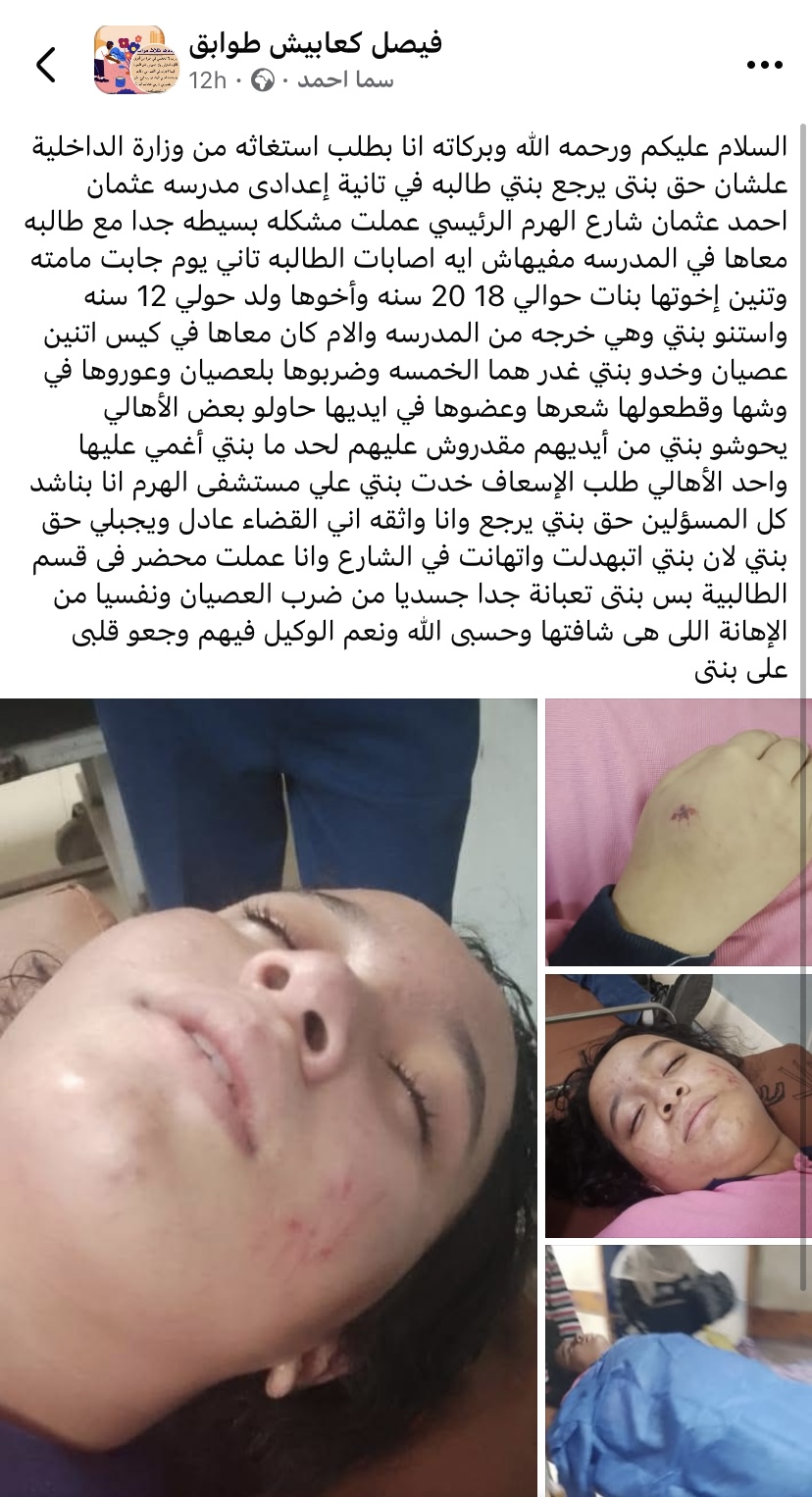 وكتبت الأم، سما أحمد، عبر حسابها على مواقع التواصل الاجتماعي: " أنا بطلب استغاثة من وزارة الداخلية علشان حق بنتي يرجع.. بنتي طالبة في الصف الثاني الإعدادي بمدرسة عثمان أحمد عثمان بشارع الهرم الرئيسي.. حصلت بينها وبين زميلتها مشكلة بسيطة جدًا في المدرسة مفيهاش أي إصابات.. تاني يوم جابت زميلتها والدتها واتنين من أخواتها البنات (حوالي 18-20 سنة) وأخوها (حوالي 12 سنة)، واستنوا بنتي وهي خارجة من المدرسة. الأم كان معاها في كيس عصيان، وهاجموا بنتي غدر وضربوها بالعصيان وعوروها في وشها وقطعوا شعرها وعضوها في إيديها.. حاول بعض الأهالي التدخل لكن مقدروش عليهم، لحد ما بنتي أغمي عليها. أحد الأهالي طلب الإسعاف ونقل بنتي إلى مستشفى الهرم".