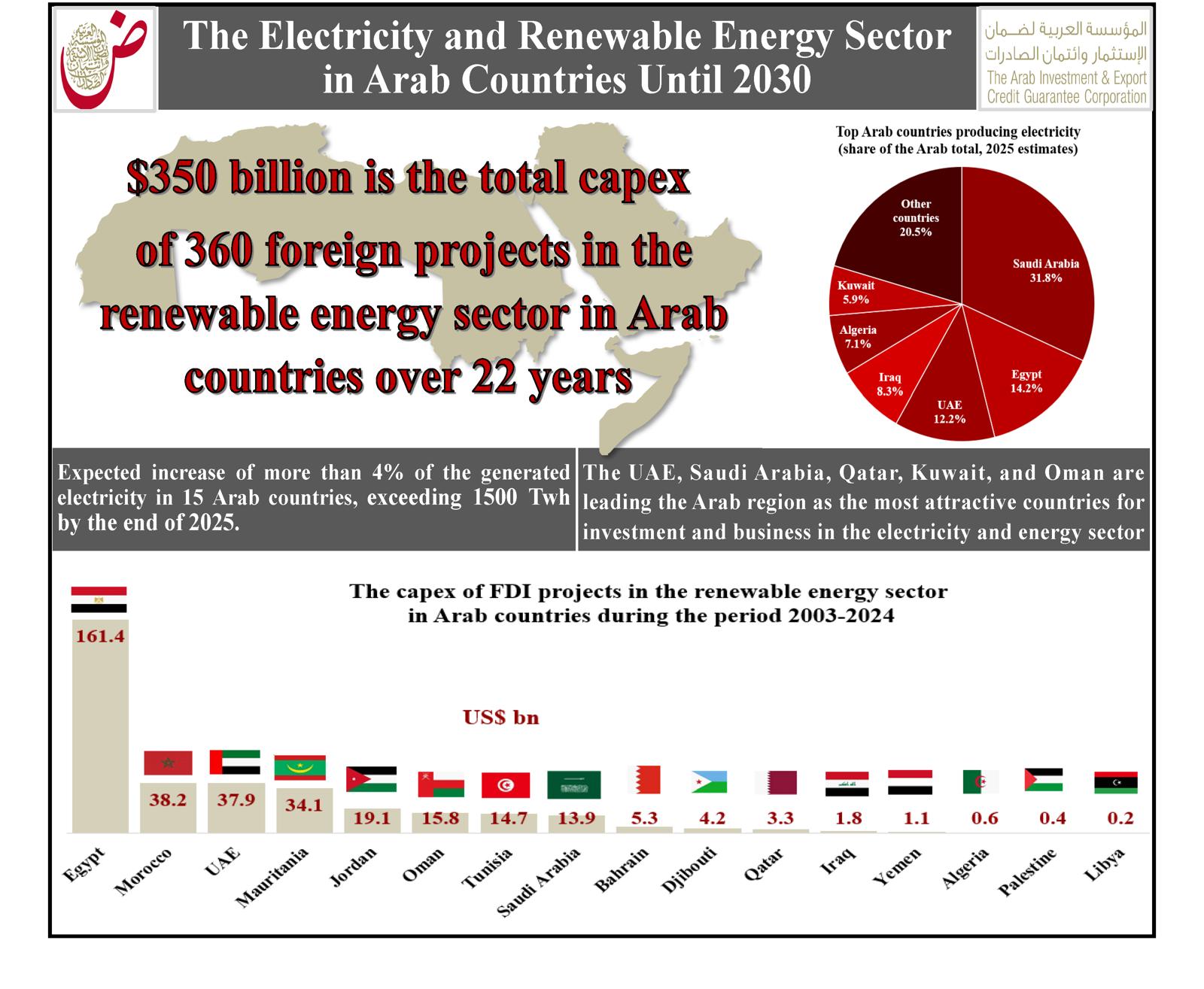 استثمارات ضخمة في قطاع الطاقة المتجددة بالمنطقة العربية، كشفت عنها المؤسسة العربية لضمان الاستثمار وائتمان الصادرات (ضمان) عن أن قطاع الطاقة المتجددة في المنطقة العربية استقطب 360 مشروعاً أجنبياً، بتكلفة استثمارية تجاوزت 351 مليار دولار ووفرت أكثر من 83 ألف وظيفة وذلك خلال الفترة من يناير 2003 وحتى ديسمبر 2024.