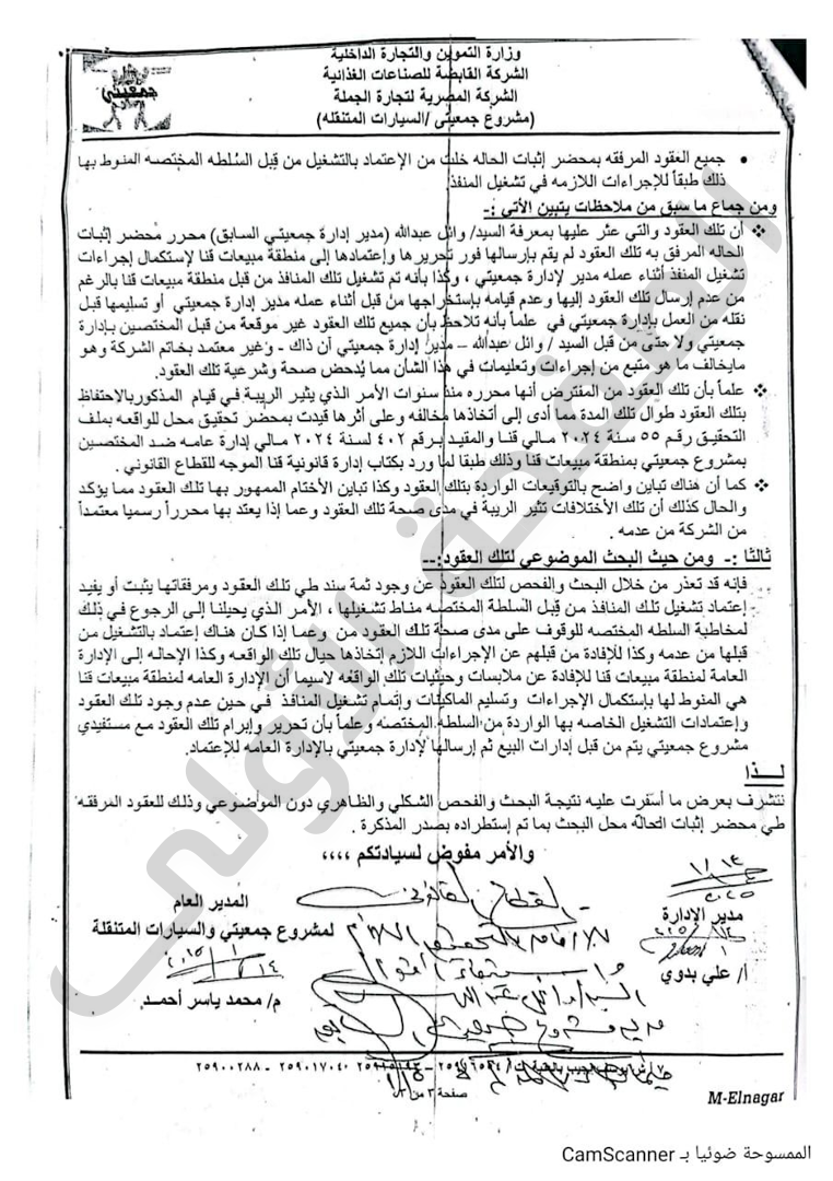 وقال المحضر أنه من حيث البحث الموضوعي لتلك العقود فقد تعذر من خلال البحث والفحص لتلك العقود عن وجود ثمة سند طي تلك العقود ومرفقاتها يثبت أو يفيد إعتماد تشغيل تلك المنافذ من قبل السلطة المختصة مناط تشغيلها، الأمر الذي يحيلنا إلى الرجوع في ذلك لمخاطبة السلطة المختصه للوقوف على مدى صحة تلك العقود من عدمه وعما إذا كان هناك إعتماد بالتشغيل من قبلها من عدمه وكذا للإفادة من قبلهم عن الإجراءات اللازم إتخاذها حيال تلك الواقعة وكذا الإحالة إلى الإدارة العامة لمنطقة مبيعات قنا للإفادة عن ملابسات وحيثيات تلك الواقعة لاسيما أن الإدارة العامة لمنطقة مبيعات قنا هي المنوط بها إستكمال الإجراءات وتسليم الماكينات وإتمام تشغيل المنافذ في حين عدم وجود تلك العقود وإعتمادات التشغيل الخاصة بها الواردة من السلطة المختصة وعلماً بأن تحرير وإبرام تلك العقود مع مستفيدي مشروع جمعيتي يتم من قبل إدارات البيع ثم إرسالها لإدارة جمعيتي بالإدارة العامة للإعتماد.