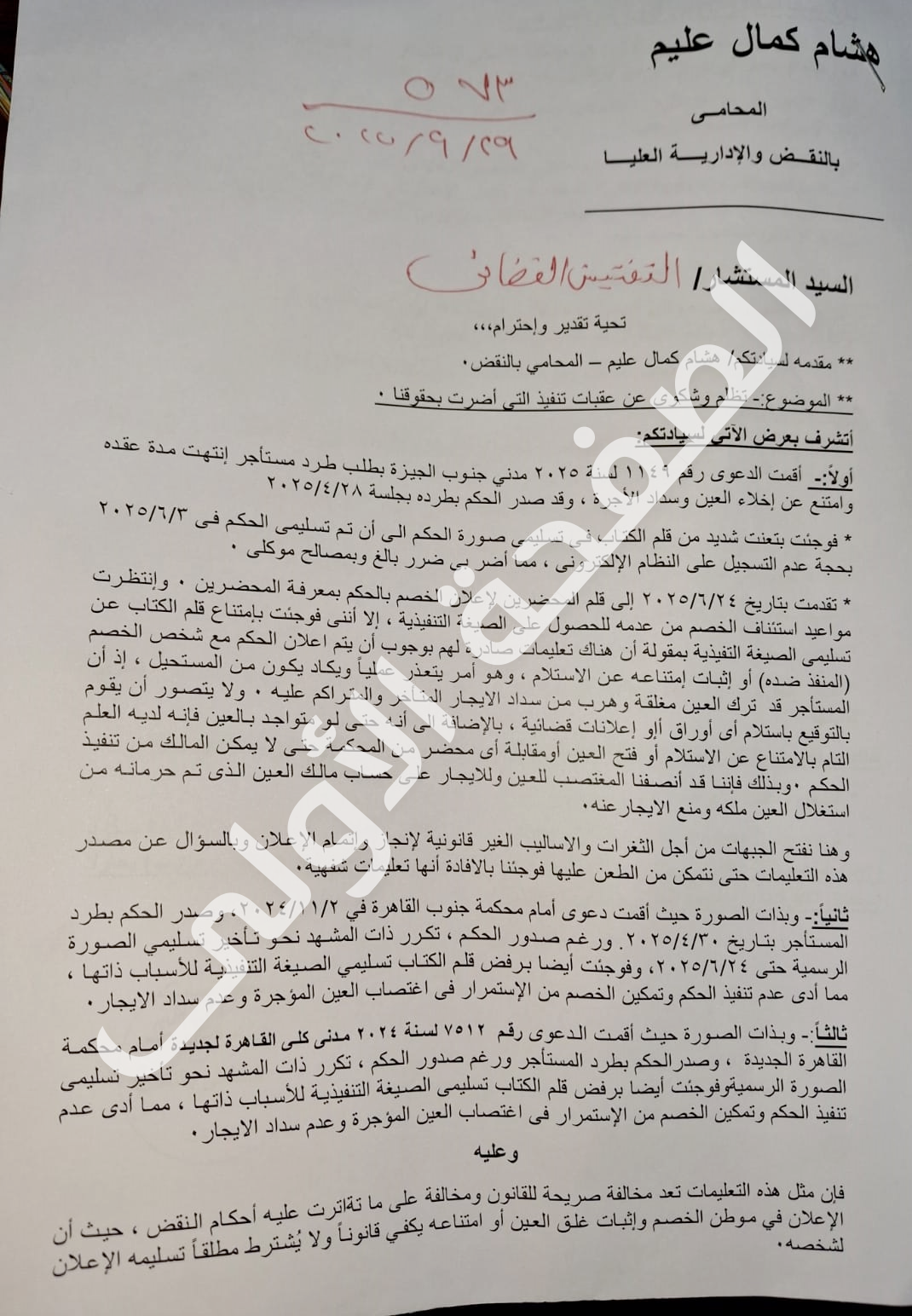 قدم هشام كمال عليم، المحامي بالنقض والإدارية العليا، شكوى إلى التفتيش القضائي، تضرَّر فيها من العقبات التي يواجهها من إدارة تنفيذ الأحكام، والتعنت في تسلُّم الصيغة التنفيذية للأحكام النهائية التي يحصل عليها، ومن بينها اشتراط إعلان الحكم لشخص الخصم المنفَّذ ضده، أو إثبات امتناعه عن الاستلام، وهو ما يخالف أحكام قانون المرافعات، وما تواترت عليه أحكام محكمة النقض.