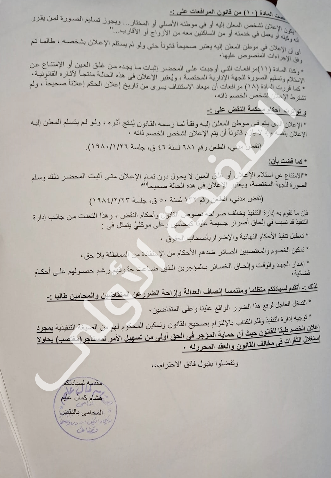 وطالب المحامي بإنصاف العدالة وإزاحة الضرر عن المتقاضين والمحامين، والتدخل العاجل لرفع هذا الضرر الواقع على المحامين والمتقاضين، وتوجيه إدارة التنفيذ وقلم الكتاب بالالتزام بصحيح القانون وتمكين المحكوم لهم من الصيغة التنفيذية بمجرد إعلان الخصم طبقًا للقانون، لأن حماية المؤجِّر في الحق أولى من تسهيل الأمر لمستأجر (مغتصب) يحاول استغلال الثغرات في مخالفة القانون والعقد المحرَّر له.