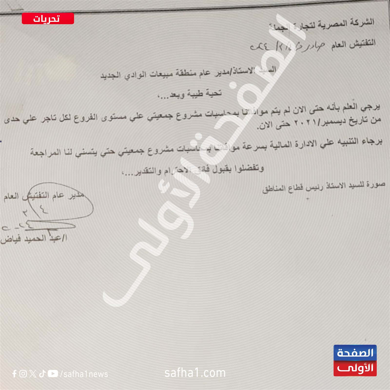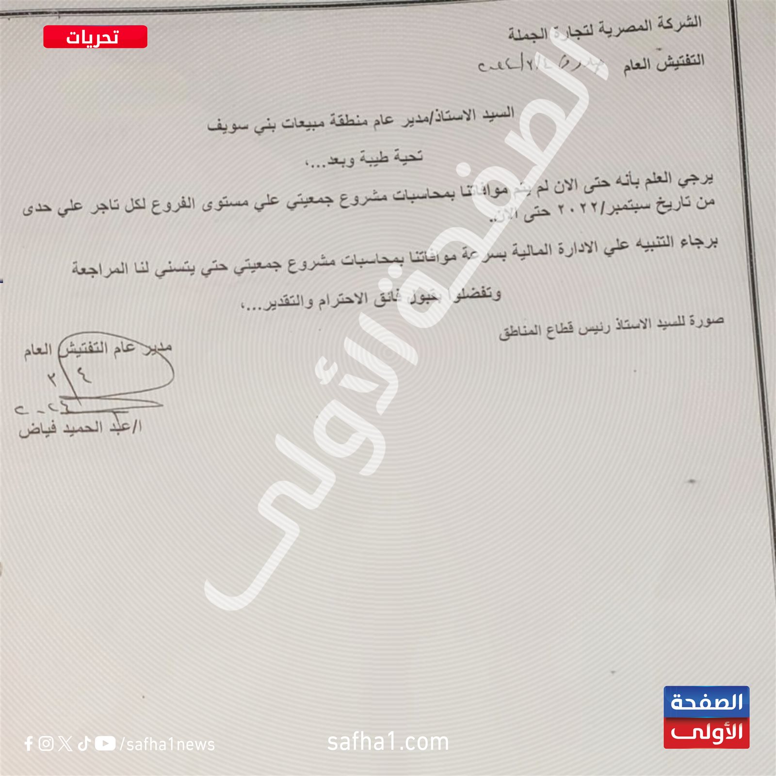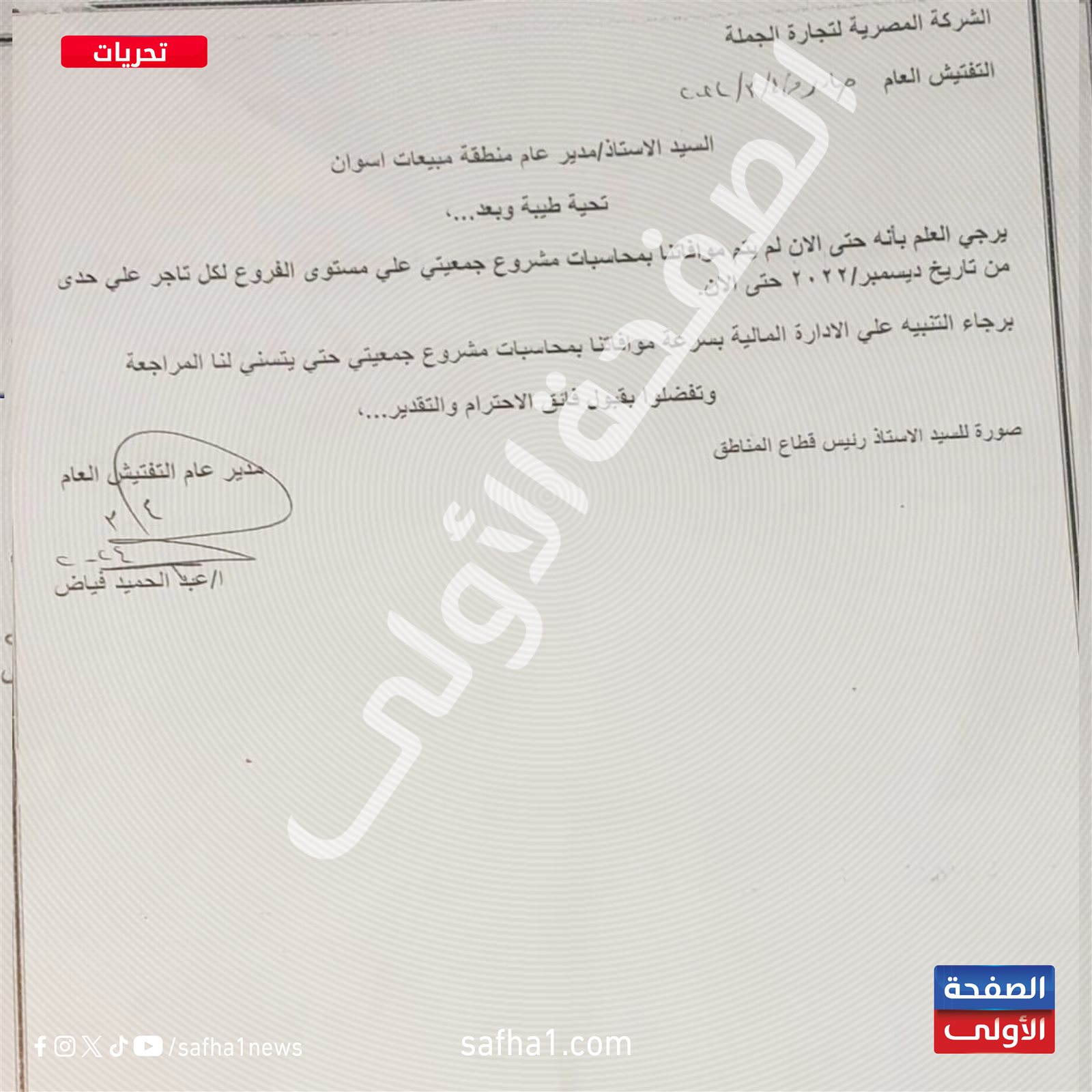 وأكدت 4 خطابات موجهة من إدارة التفتيش العام بالشركة المصرية لتجارة الجملة، إلى مناطق مبيعات بنى سويف والوادي الجديد وأسوان والبحر الأحمر - حصل موقع «الصفحة الأولى» على نسخة منها -، على تقاعس المسئولين عن مشروع جمعيتى بهذه المناطق عن تقديم المستندات الخاصة بالمحاسبات منذ سبتمبر 2022، وهو ما يشير إلى حالات صرف بأزيد من النسب المقررة للتجار.