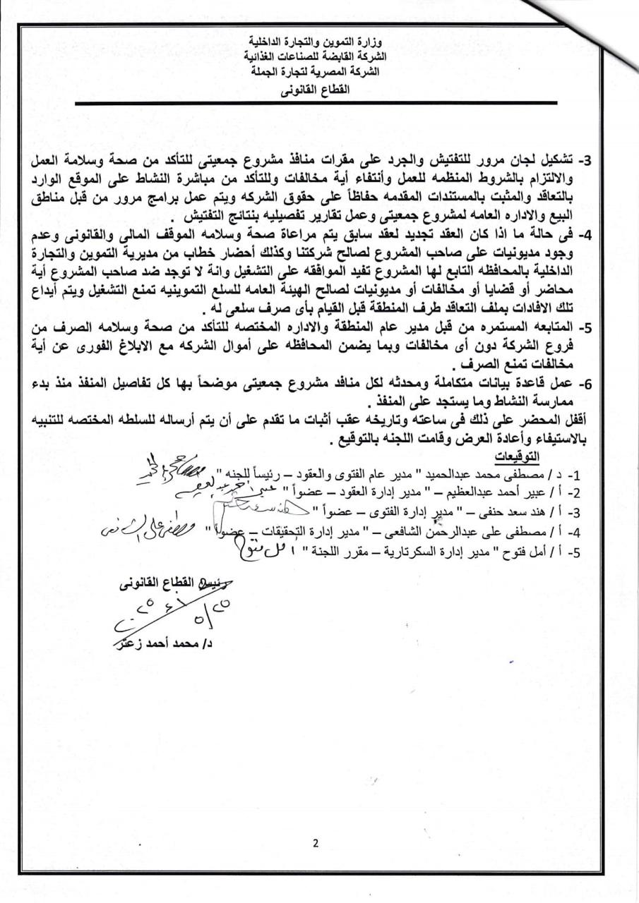كشف محضر اجتماع لجنة مراجعة مشروع جمعيتي بالشركة المصرية لتجارة الجملة، عن خلو بعض ملفات العقود من موافقة الدكتور شريف فاروق، وزير التموين والتجارة الداخلية،على تشغيل هذه المنافذ.