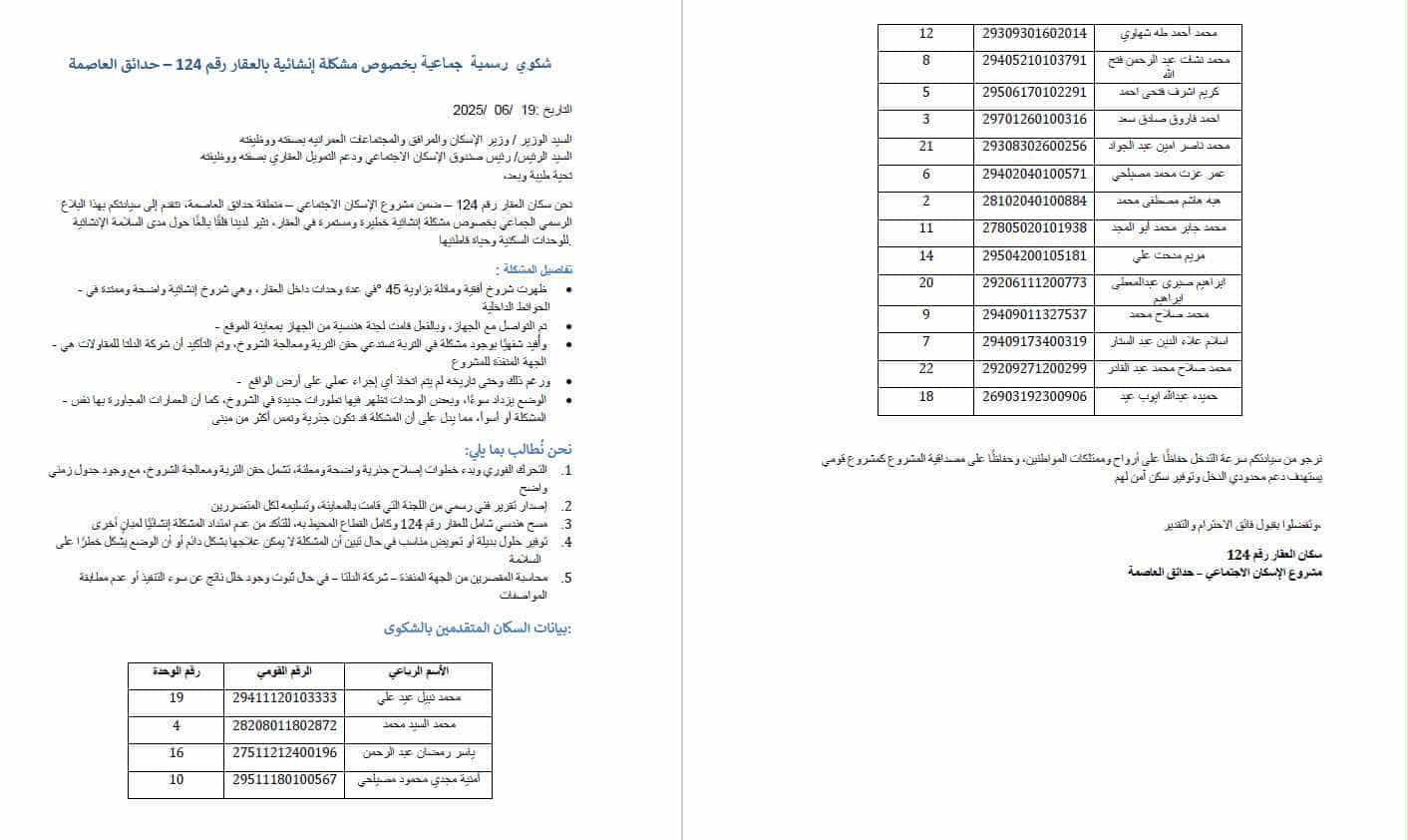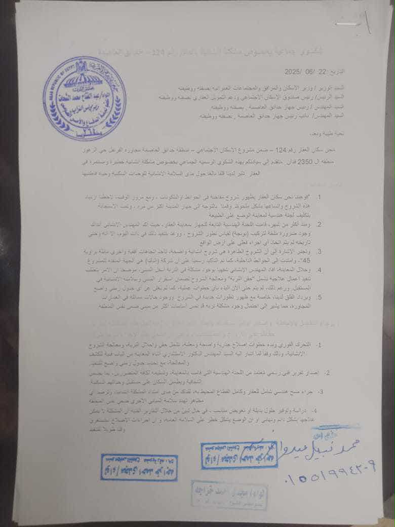 وأضاف السكان، ان الأزمة الثانية التي يعانون منها، هي اكتشاف تعرض العديد من العمارات لشروخ في أماكن تهدد بانهيارها، ما يعرض حياتهم للخطر، حيث ظهرت الشروخ في "الكمرات" والسقف والأعمدة الخرسانية، مطالبين المسؤولين عن المدينة بالتدخل لمعالجتها أو البحث عن بدائل لتامين حياتهم بدلا من العيش في شقق مهددة بالانهيار في أي لحظة، وضربوا مثالا بالعمارة رقم 1336، وهي قالوا غنه رغم انها حديثة الانشاء ولم تسكن بعد، فهي مهددة بالانهيار بسبب ظهور العديد من الشروخ فيها.