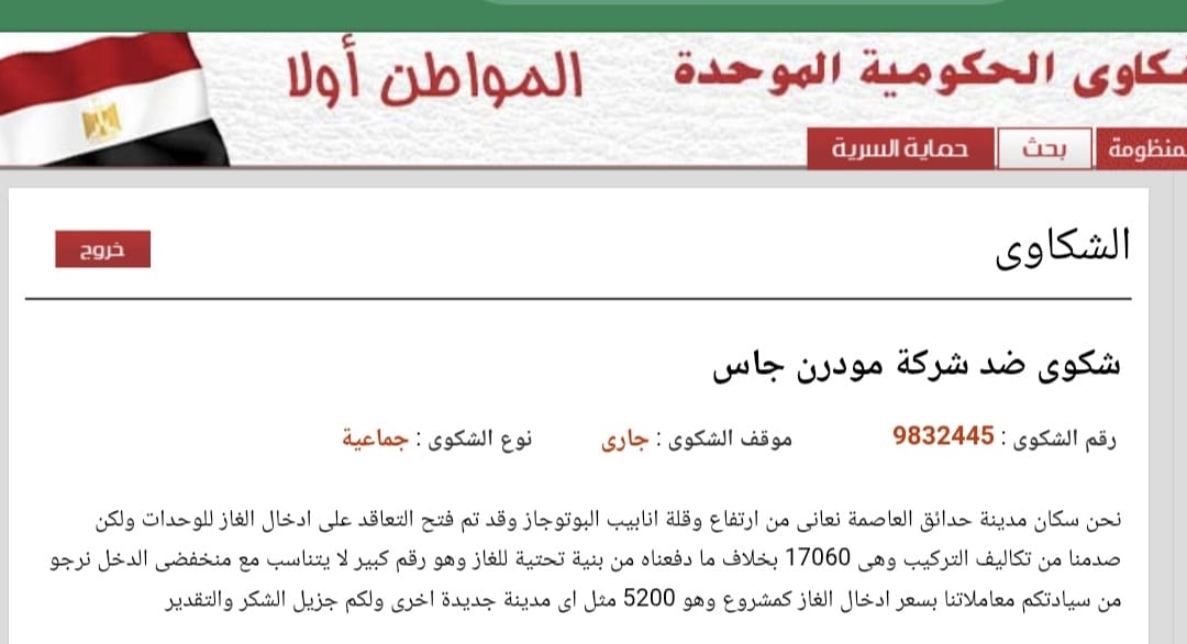 وأضاف سكان مدينة الجيل الرابع التابعة لجهاز تنمية مدينة حدائق العاصمة، أن أزمة توصيل الغاز الطبيعي مازالت مستمرة، مع اصرار شركة مودرن جاس على توصيل الخدمة لهم مقابل حوالي 18 ألف و500 جنيه، قائلة إنها تكلفة توصيل الغاز للشقق، كما تصل التكلفة إلى 35 ألف جنيه عند التقسيط، رغم أن التكلفة في باقي الشركات لا تتخطى 5200 جنيها، وقدموا الشكوى رقم 9832445 إلى منظومة الشكاوى بمجلس الوزراء، ولكن دون استجابة.