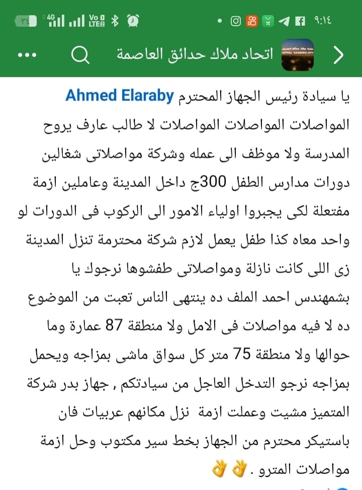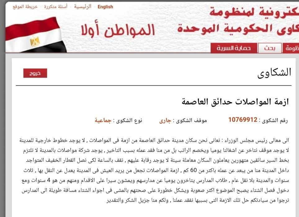 وقال حسن عبدالرازق، وعلي المصري، ومحمد السيد، إنهم أرسلوا العديد من الشكاوى إلى المهندس أحمد العربي رئيس جهاز حدائق العاصمة، وإلى منظومة الشكاوى في مجلس الوزراء، ومنها الشكوى رقم 10769912، من غياب وسائل المواصلات المناسبة في مدينة الجيل الرابع التابعة للجهاز، وهو ما تسبب، في مشقة كبيرة على جميع السكان، بداية من كبار السن والمرضى، وكذلك أولياء الأمور الذين يعانون في توصيل أولادهم إلى المدارس، كما يتأخرون عن أعمالهم ومصالحهم.