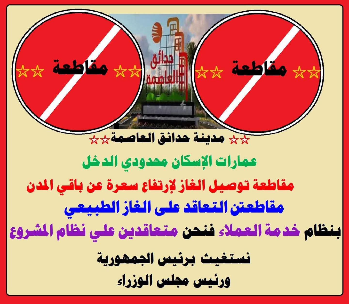 ويأتي ذلك، بالرغم من أن جهاز المدينة تقاضى تكاليف البنية التحتية عند تسليم الشقق للسكان، ورغم ذلك اتفق مع شركة مودرن جاس على توصيل الغاز الطبيعي بالنظام الاستثماري، مع عدم وجود دعم لهم.