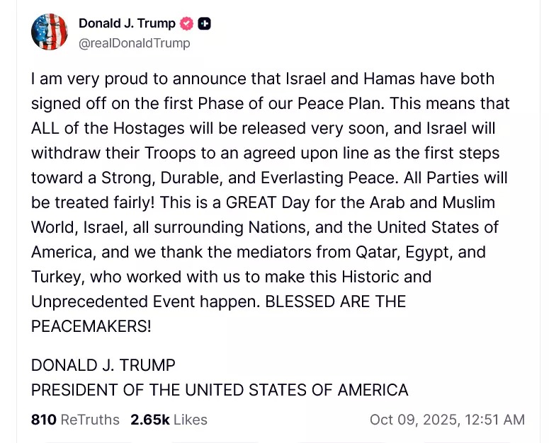 أعلن الرئيس الأمريكي دونالد ترامب عن توصل حماس وإسرائيل إلى اتفاق بشأن المرحلة الأولى من اتفاق السلام.. وكتب ترامب على منصته تروث سوشال: "يسعدني أن أعلن بكل فخر أن إسرائيل وحماس قد وقّعتا على المرحلة الأولى من خطة السلام التي وضعناها.. مما يعني أن جميع الرهائن سيتم إطلاق سراحهم قريبًا جدًا، وأن إسرائيل ستسحب قواتها إلى خط متفق عليه، كخطوة أولى نحو سلام قوي، مستدام، ودائم.. وسيتم التعامل مع جميع الأطراف بعدالة.. وتوجه ترامب بالشكر إلى الوسطاء من قطر ومصر وتركيا الذين تعاونوا معنا لتحقيق هذا الحدث التاريخي وغير المسبوق".. وألمح ترامب إلى أنه سيتوجه للشرق الأوسط السبت أو الأحد، ووفقا للإعلام الأمريكي فإن ترامب سيجري يوم غد الجمعة الكشف الصحي الدوري، الذي يجرى دائماً للرؤساء الأمريكان للاطمئنان على أوضاعهم الصحية.