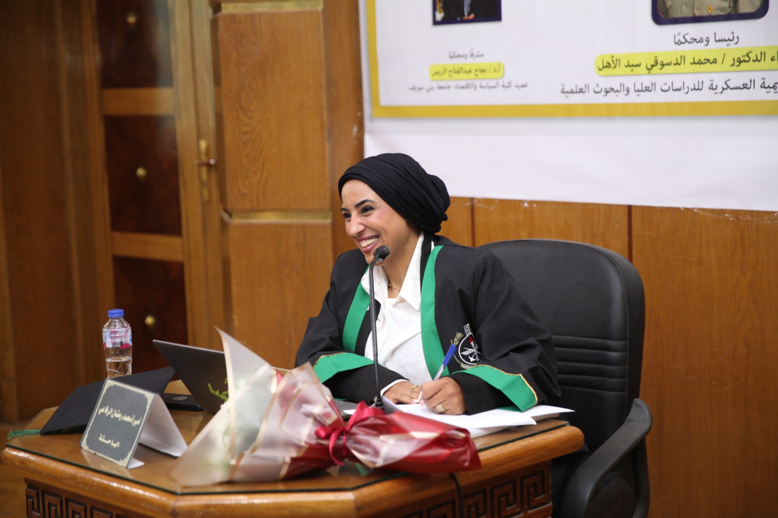 ترأس لجنة الحكم والمناقشة اللواء الدكتور محمد الدسوقي سيد الأهل، مساعد مدير الأكاديمية العسكرية للدراسات العليا والبحوث العلمية، وإشراف الدكتور نجاح عبد الفتاح الريس، عميد كلية السياسة والاقتصاد بجامعة بني سويف، وعضوية العقيد أركان حرب الدكتور محمد محي الدين ومن جانبها أشادت اللجنة بمستوى الرسالة وأهميتها العلمية في تناول أحد أخطر التحديات التي تواجه الأمن القومي العربي في العصر الرقمي، ومنحت الباحثة الدرجة العلمية عن جدارة، مثمنة جهدها البحثي وأسلوبها التحليلي الرصين.