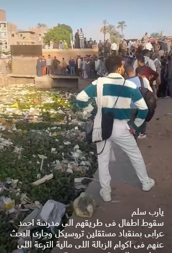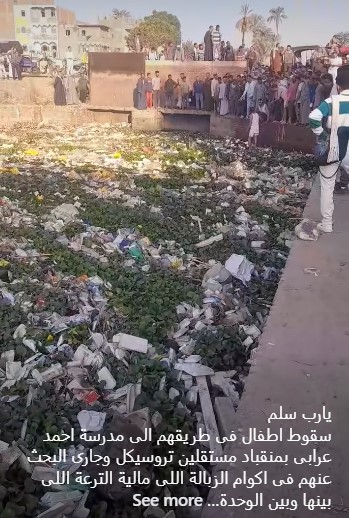 وأضافوا : "الحادث حصل الصبح سقط الاطفال فى طريقهم الى مدرسة احمد عرابى بمنقباد مستقلين تروسيكل وجارى البحث عنهم فى اكوام الزبالة اللى مالية الترعة اللى بينها وبين الوحدة المحلية كام متر لو طفل واحد اتوفى ذنبه فى رقبة بتوع الوحدة المحلية واهمالهم"