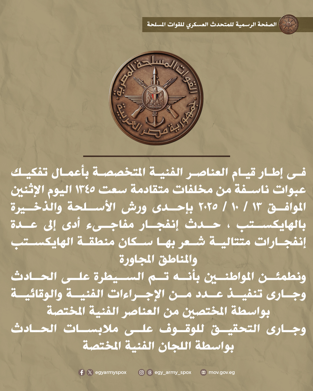 أعلن المتحدث العسكري باسم القوات المسلحة عميد أركان حرب غريب عبد الحافظ غريب، أن انفجارًا مفاجئًا وقع صباح اليوم الإثنين 13 أكتوبر 2025 بإحدى ورش الأسلحة والذخيرة بمنطقة الهايكستب، أثناء قيام العناصر الفنية المتخصصة بأعمال تفكيك عبوات ناسفة من مخلفات متقادمة.