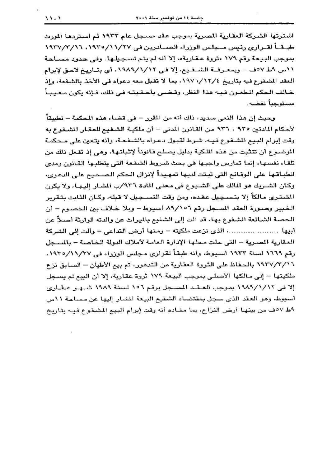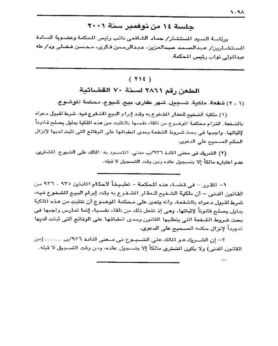 وأضافت محكمة النقض أن الشريك في معنى المادة 936 /ب من القانون المدني هو المالك على الشيوع، ولا يعتبر المشترى مالكًا إلا بتسجيل عقده، ومن وقت التسجيل لا قبله، كما أنه على محكمة الموضوع بحث شروط الشفعة ومدى انطباقها على الوقائع الثابتة لديها تمهيدًا لإصدار حكم صحيح في الدعوى.