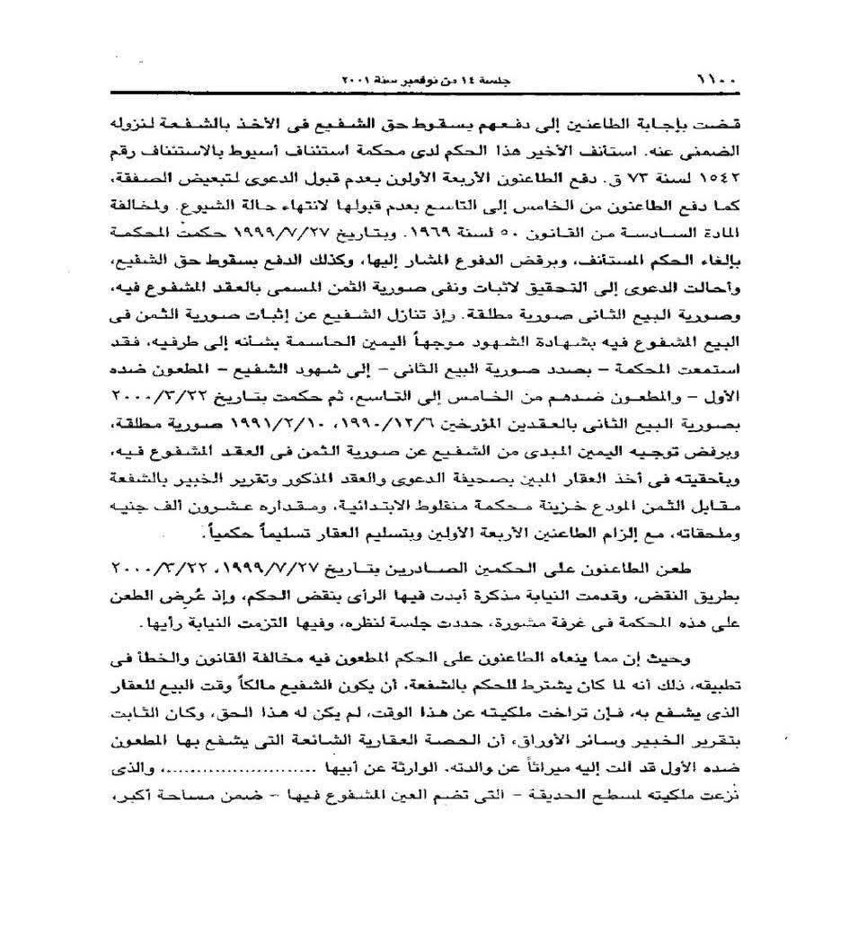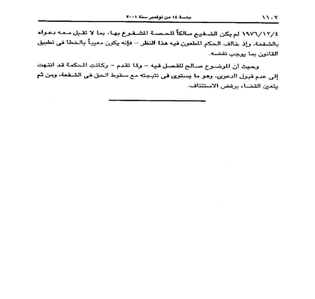 كما أن محكمة الموضوع مطالبة من تلقاء نفسها بالتثبت من ملكية الشفيع بدليل قانوني صالح، ومتى لم تتوافر الملكية وقت البيع فإن دعوى الشفعة لا تقبل، ولذلك قضت محكمة النقض بنقض الحكم المطعون فيه لكونه مخالفًا للقانون في شأن شرط ملكية الشفيع وقت إبرام البيع، وبما أن النتيجة على ما تقدم تعادل سقوط حق الشفيع في الشفعة، تقضي المحكمة برفض الدعوى ورفض الاستئناف.