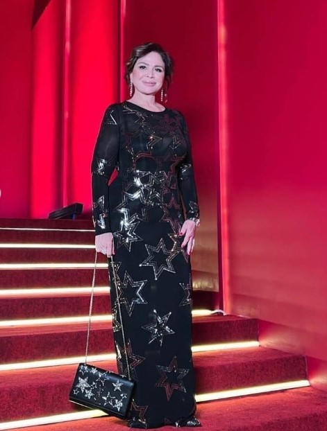 واختتمت حديثها بصورة من تصميم فستان إلهام شاهين المزين بالنجوم الفضية اللامعة متعددة الأحجام على خلفية سوداء بلون الفستان: «اللي يجهل رمزه بيجهل قيمته، والجمال من غير وعي بيتحول بسهولة لرمز موجع».