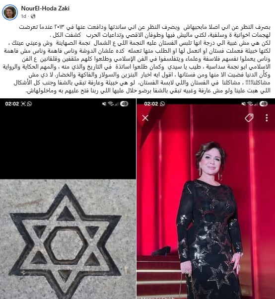 وأضافت زكي: "لكن هي مش غبية الي درجة انها تلبس الفستان عليه النجمة اللي ع الشمال نجمة الصهاينة وش وعيني عينك ، لكنها خبيثة فعملت فستان او اتعمل لها او الطلب منها تعمله كده علشان الدوشة وناس فاهمة وناس مش فاهمة وناس يعملوا نفسهم فلاسفة وعلماء ويتفلسفوا في الفن الإسلامي وطلعوا كلهم مثقفين وقلقانين ع الفن الاسلامي ابو نجمة سداسية ، طيب يا سيدي وكمان طلعوا اساتذة في التاريخ والذي منه ، والمهم الحكاية والرواية وكأن الدنيا فضيت الا منها ومن فستانها، اقول ايه اخبار البنزين والسولار والفاكهة والخضار. لا دي مش مشاكلنا!!!! ، مشاكلنا في الفستان واللي لابسة الفستان