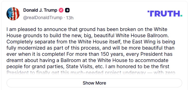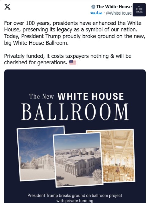 في المقابل، كتب ترامب عبر منصته «تروث سوشيال»، اليوم الثلاثاء: "يسرني أن أعلن بدء العمل في أرض البيت الأبيض لبناء قاعة الرقص الجديدة والكبيرة والجميلة".
