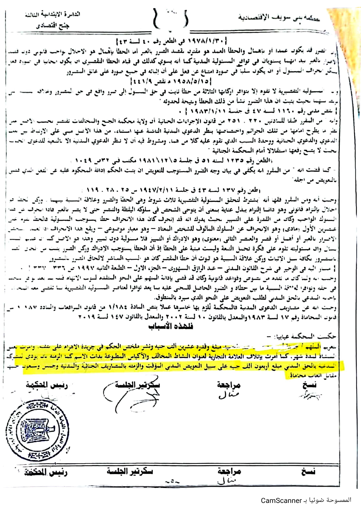 وقالت محكمة بني سويف الاقتصادية، في حيثيات حكمها الرادع إنه من المقرر فقها أنه يشترط لتحقق المسئولية التقصيرية ثلاث شروط، وهى الخطأ والضرر وعلاقة السببية بينهما، وركن الخطأ هو اخلال بإلتزام قانوني، وهو دائما التزام يبذل عناية بمعنى أن يتوخى الشخص في سلوكه اليقظة والتبصر حتى لا يضر بالغير، فإذا انحرف عن هذا السلوك الواجب وكان من القدرة على التمييز بحيث يدرك أنه قد انحرف كان هذا الانحراف خطأ يستوجب المسئولية.