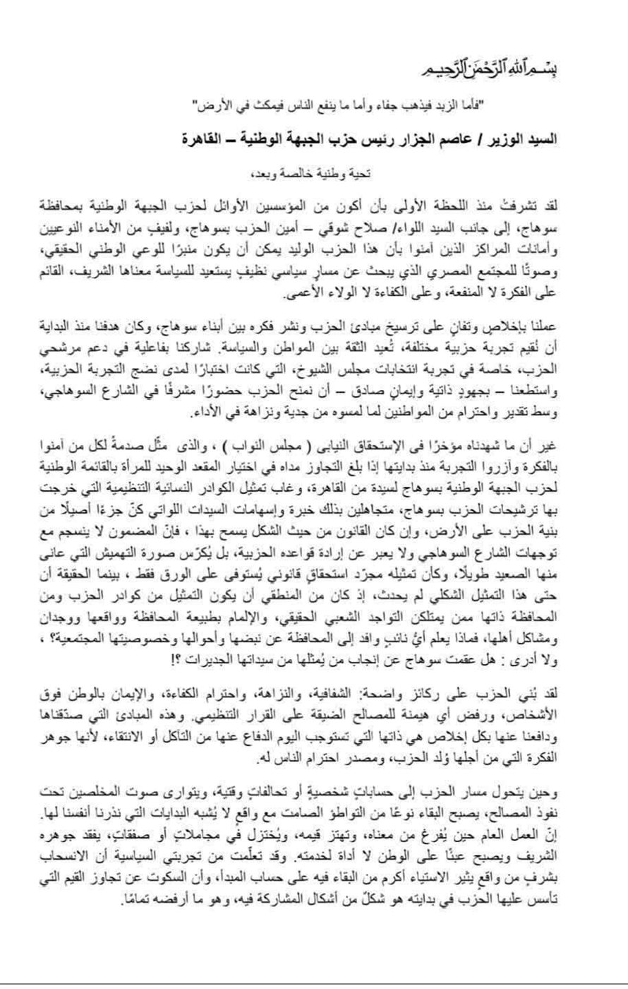 وأضاف "أعتذر عن فشل لا ناقة لي فيه ولا جمل، فشل حطم آمالنا وأحلامنا على صخرة الإقصاء والبيع والشراء وسوء الاختيار"، موضحًا أنه أرسل رسالة رسمية إلى الحزب ومعها الدكتورة هبة العطار، أمينة المرأة، متضمنة استقالتهما من موقعيهما التنظيميين.