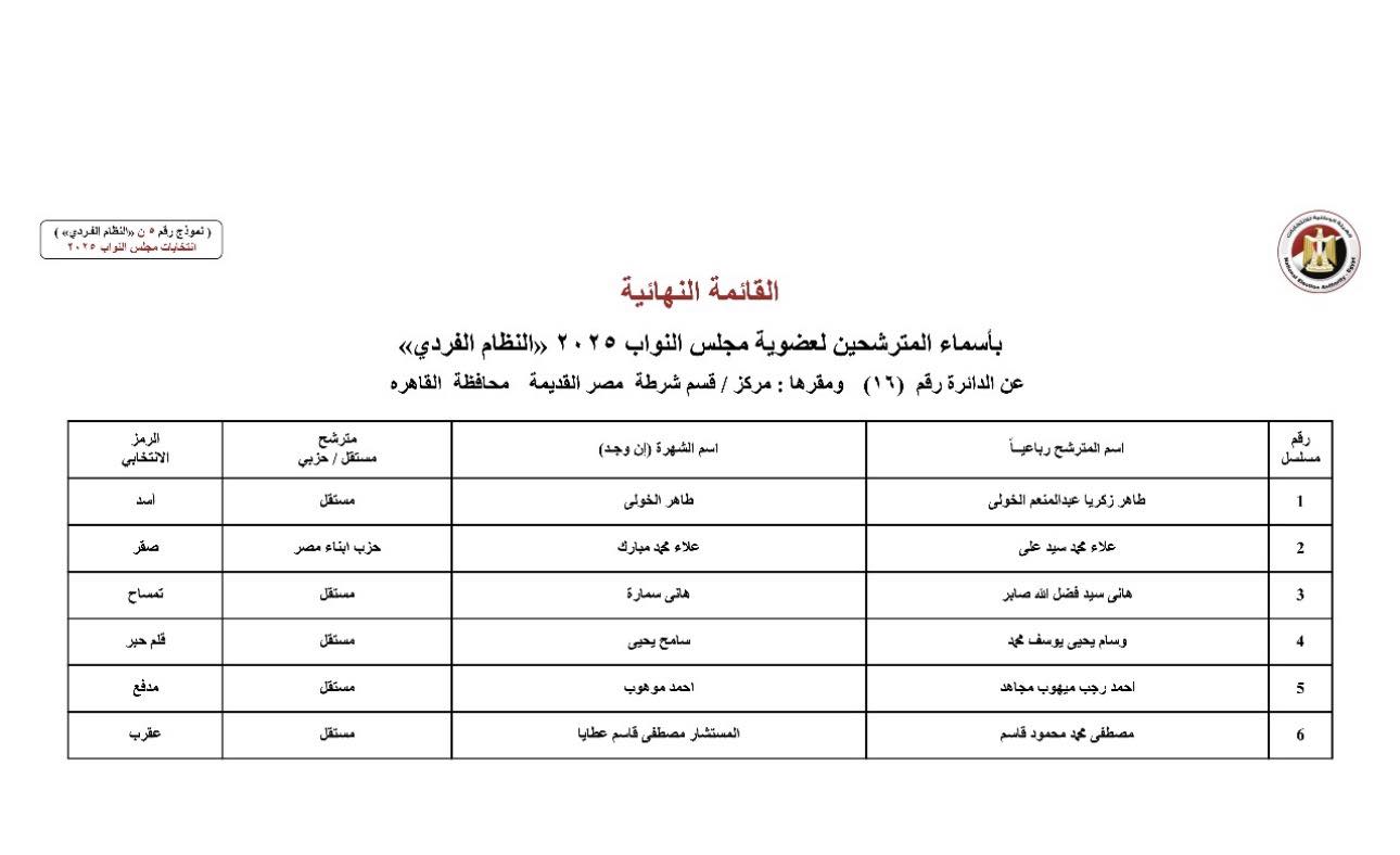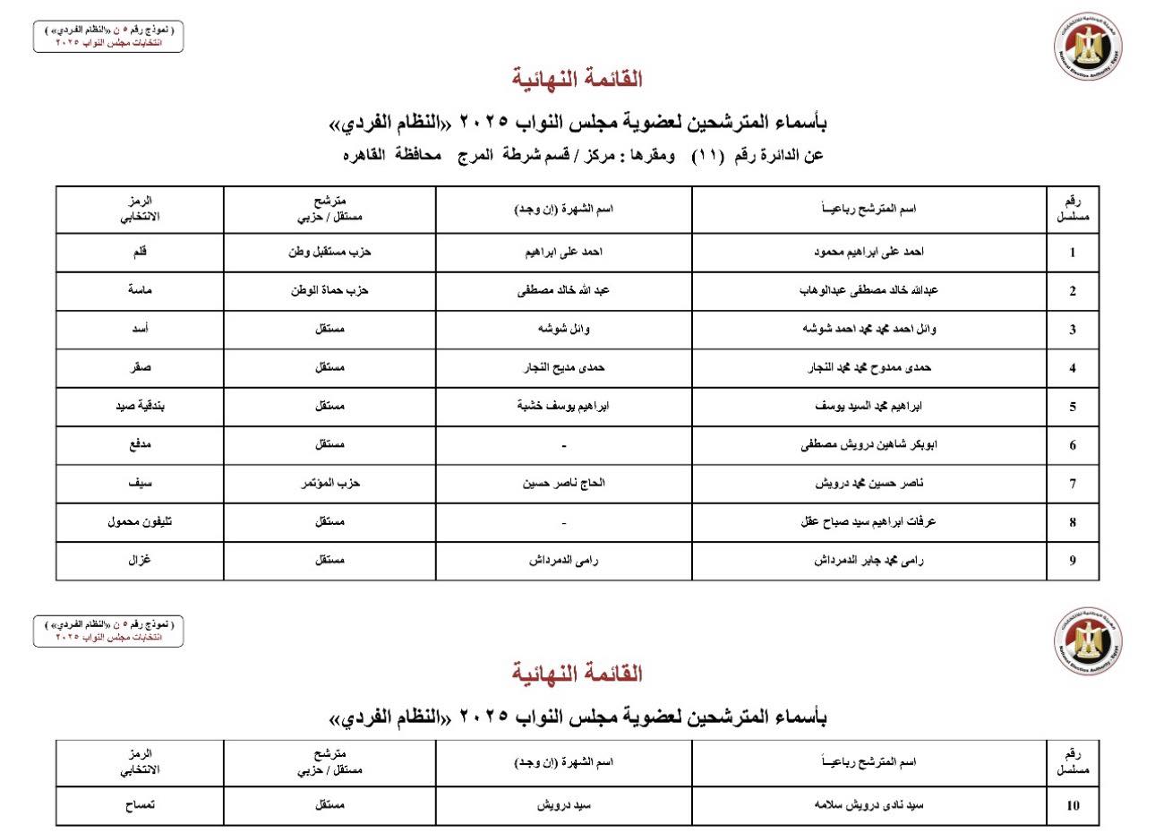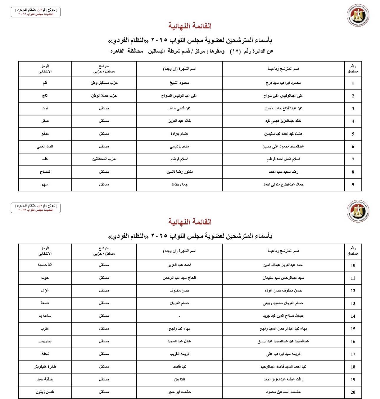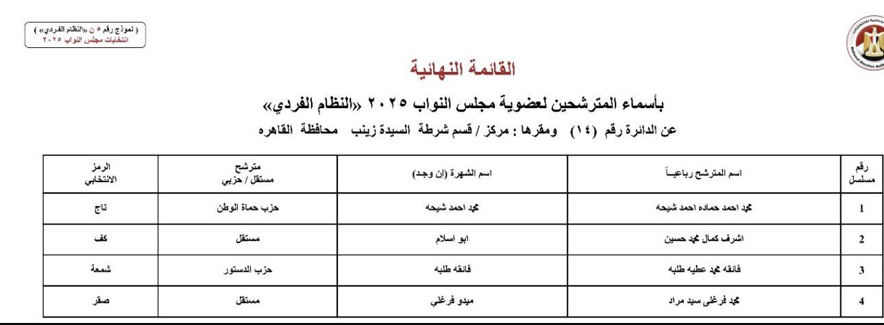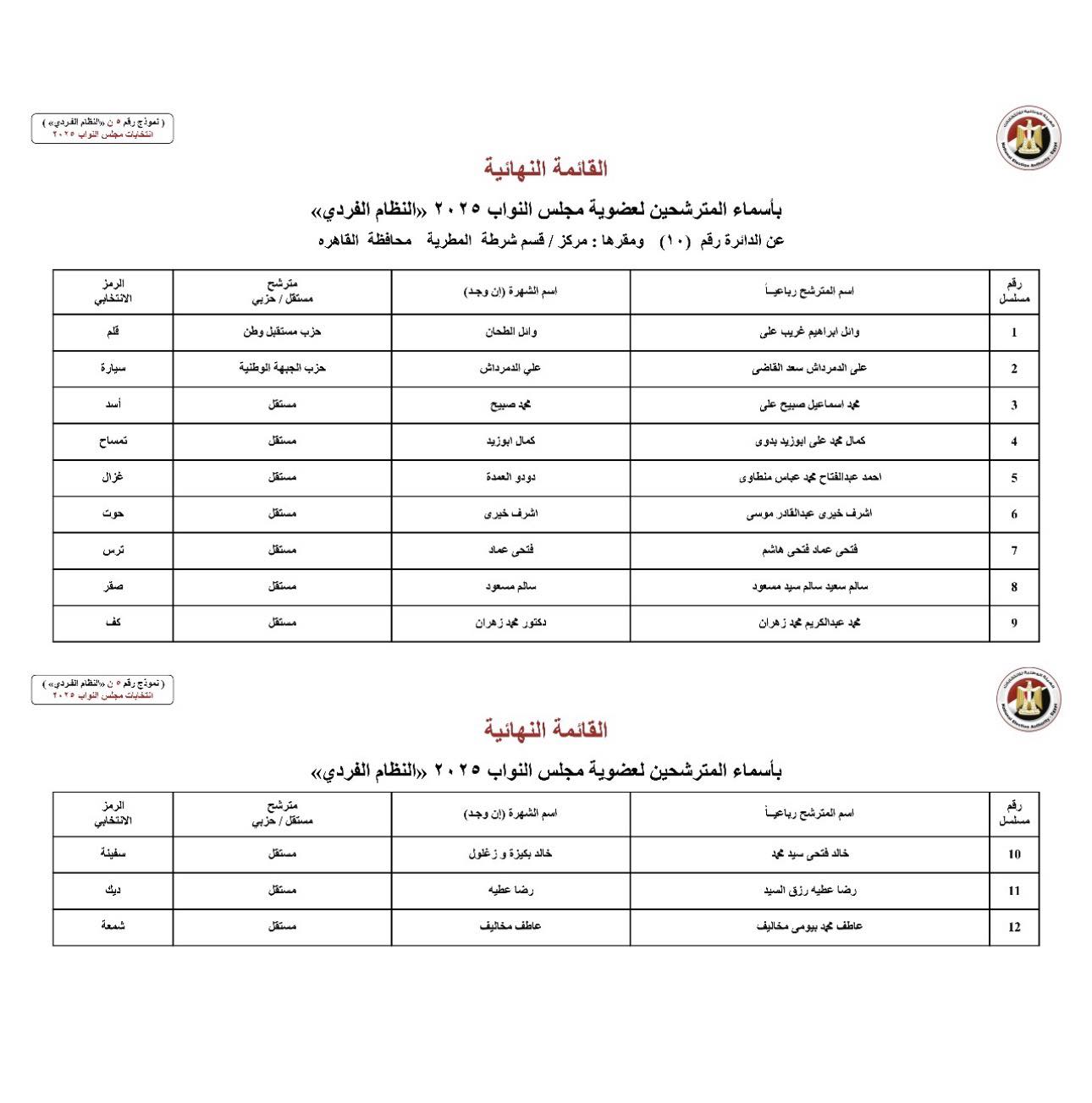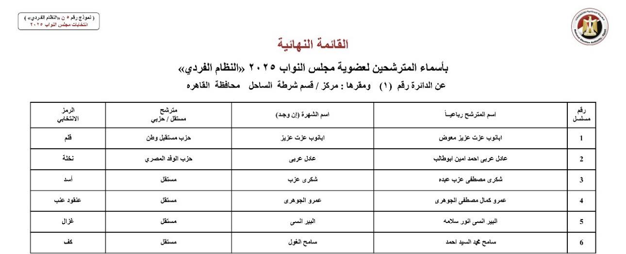 وجاء قرار الهيئة الوطنية للانتخابات برئاسة المستشار حازم بدوي، بإعلان القائمة النهائية للمرشحين، في ضوء انتهاء المدة القانونية المحددة لتقديم الطعون الانتخابية والفصل فيها أمام قضاء مجلس الدولة، سواء الطعون من جانب راغبي الترشح الذين استُبعدوا بمعرفة لجان تلقي وفحص طلبات الترشح، أو من الطاعنين على أسماء بعض المترشحين الواردة أسماؤهم في كشوف القائمة المبدئية.