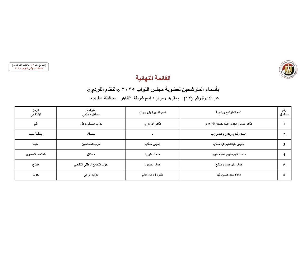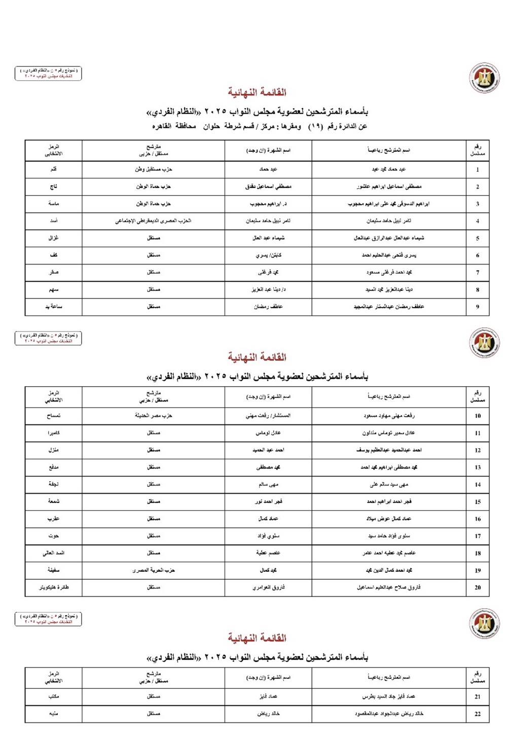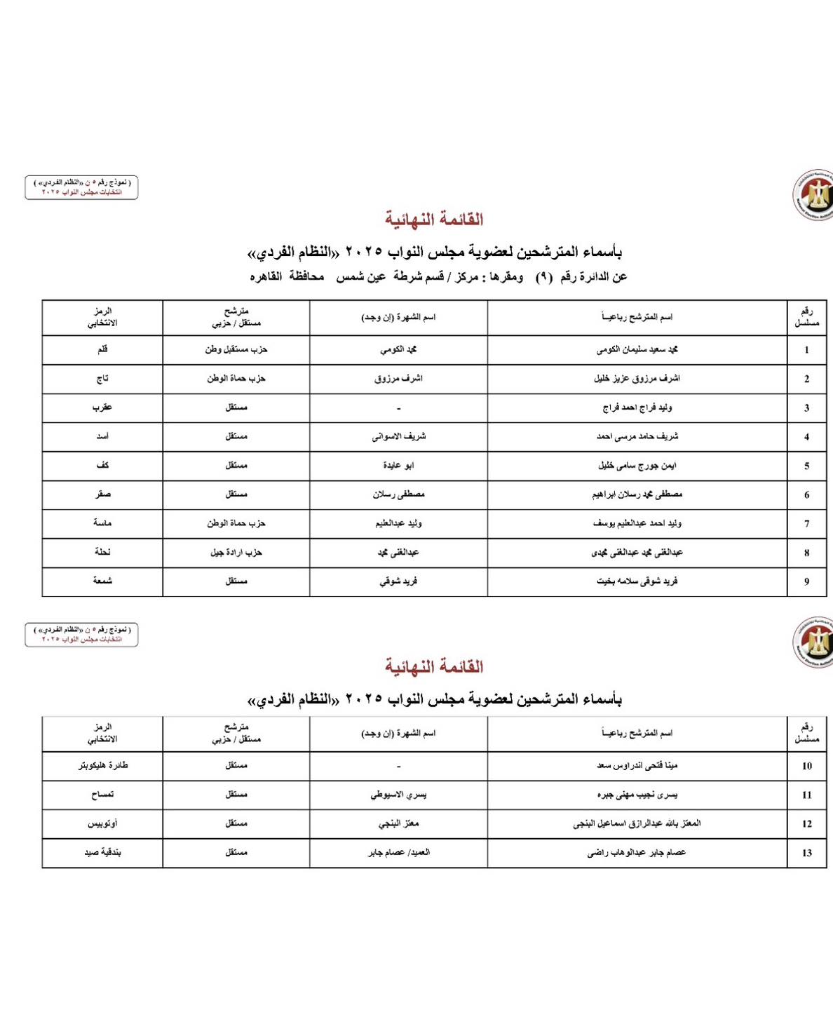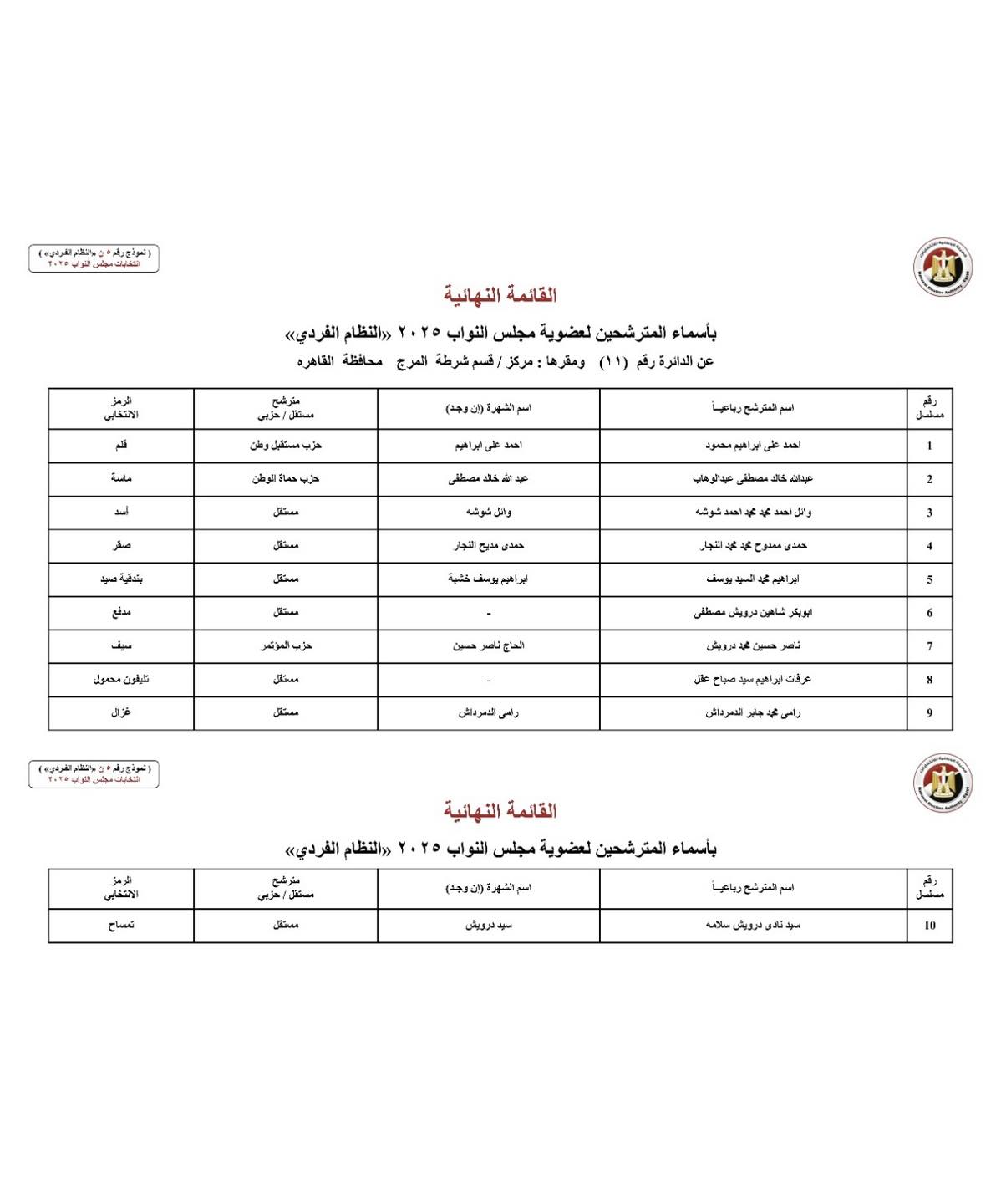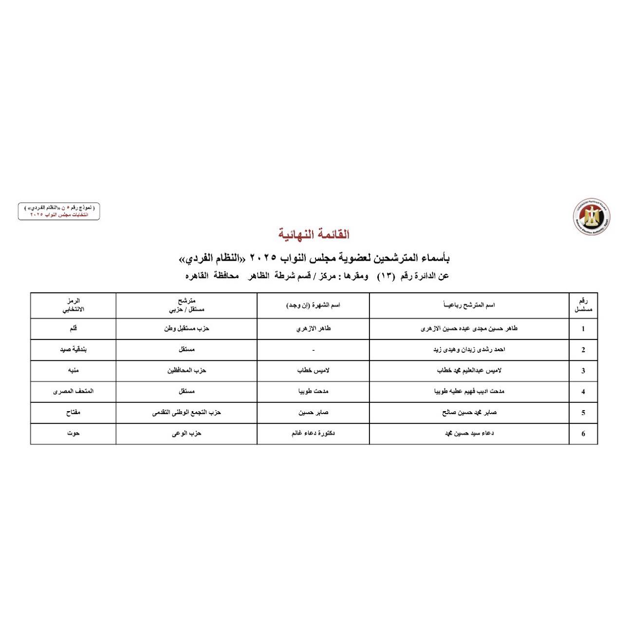 وجاء قرار الهيئة الوطنية للانتخابات برئاسة المستشار حازم بدوي، بإعلان القائمة النهائية للمرشحين، في ضوء انتهاء المدة القانونية المحددة لتقديم الطعون الانتخابية والفصل فيها أمام قضاء مجلس الدولة، سواء الطعون من جانب راغبي الترشح الذين استُبعدوا بمعرفة لجان تلقي وفحص طلبات الترشح، أو من الطاعنين على أسماء بعض المترشحين الواردة أسماؤهم في كشوف القائمة المبدئية.