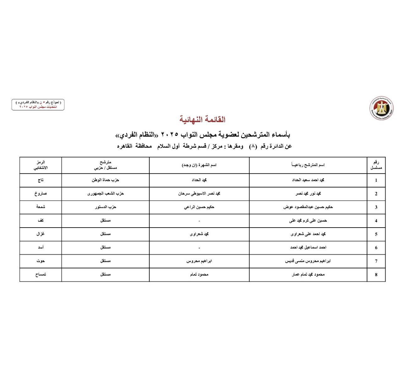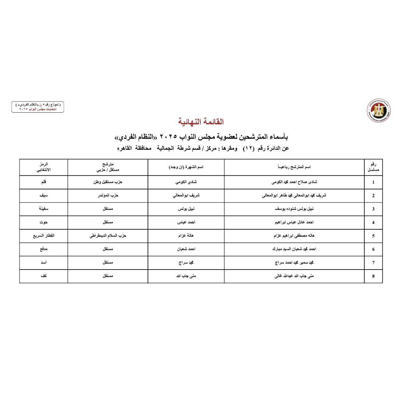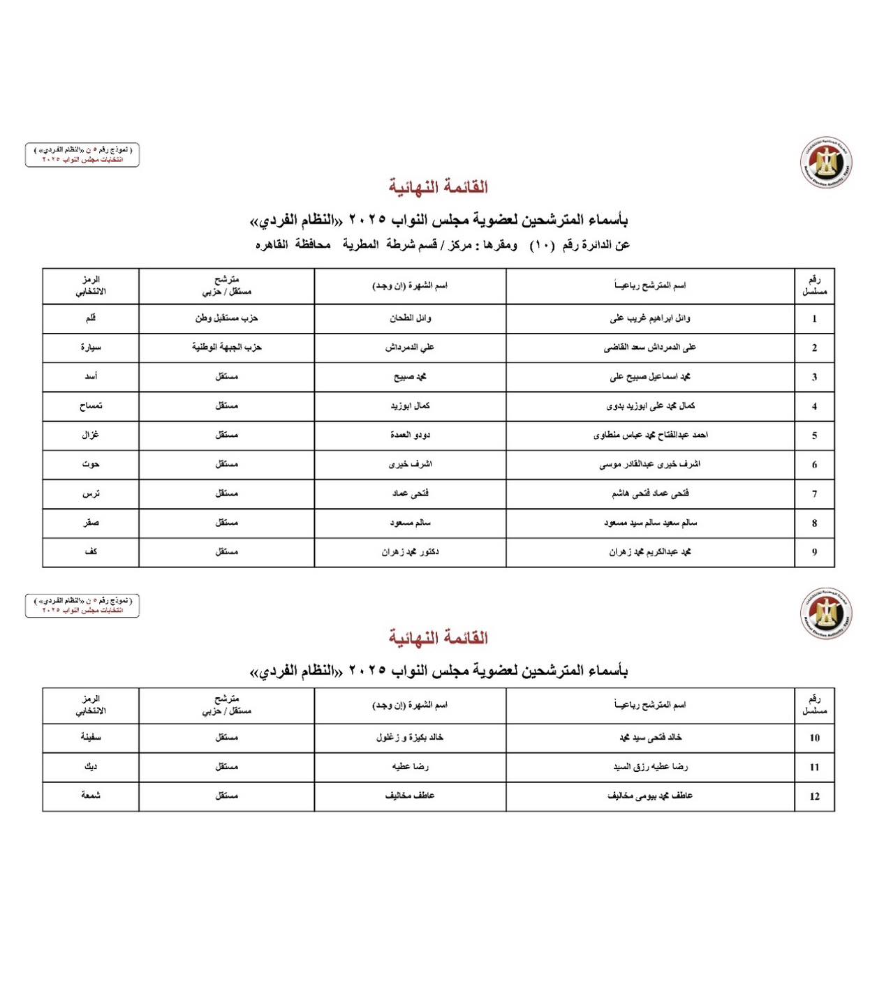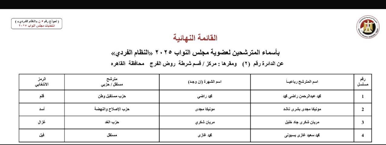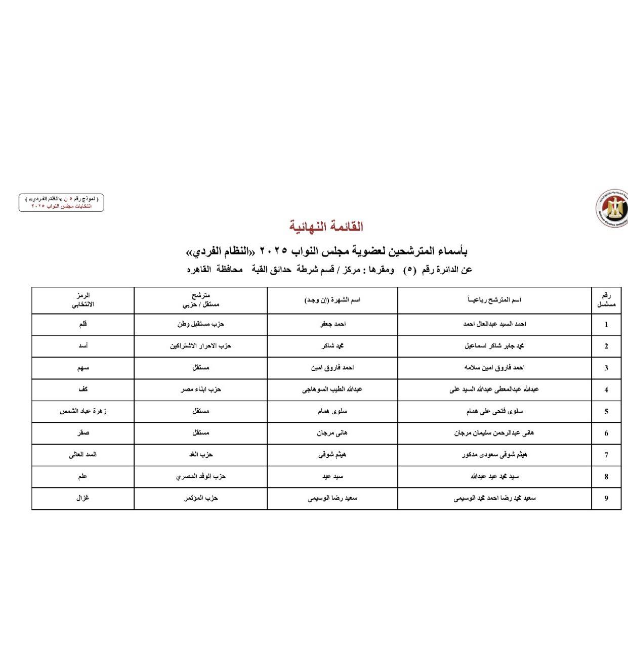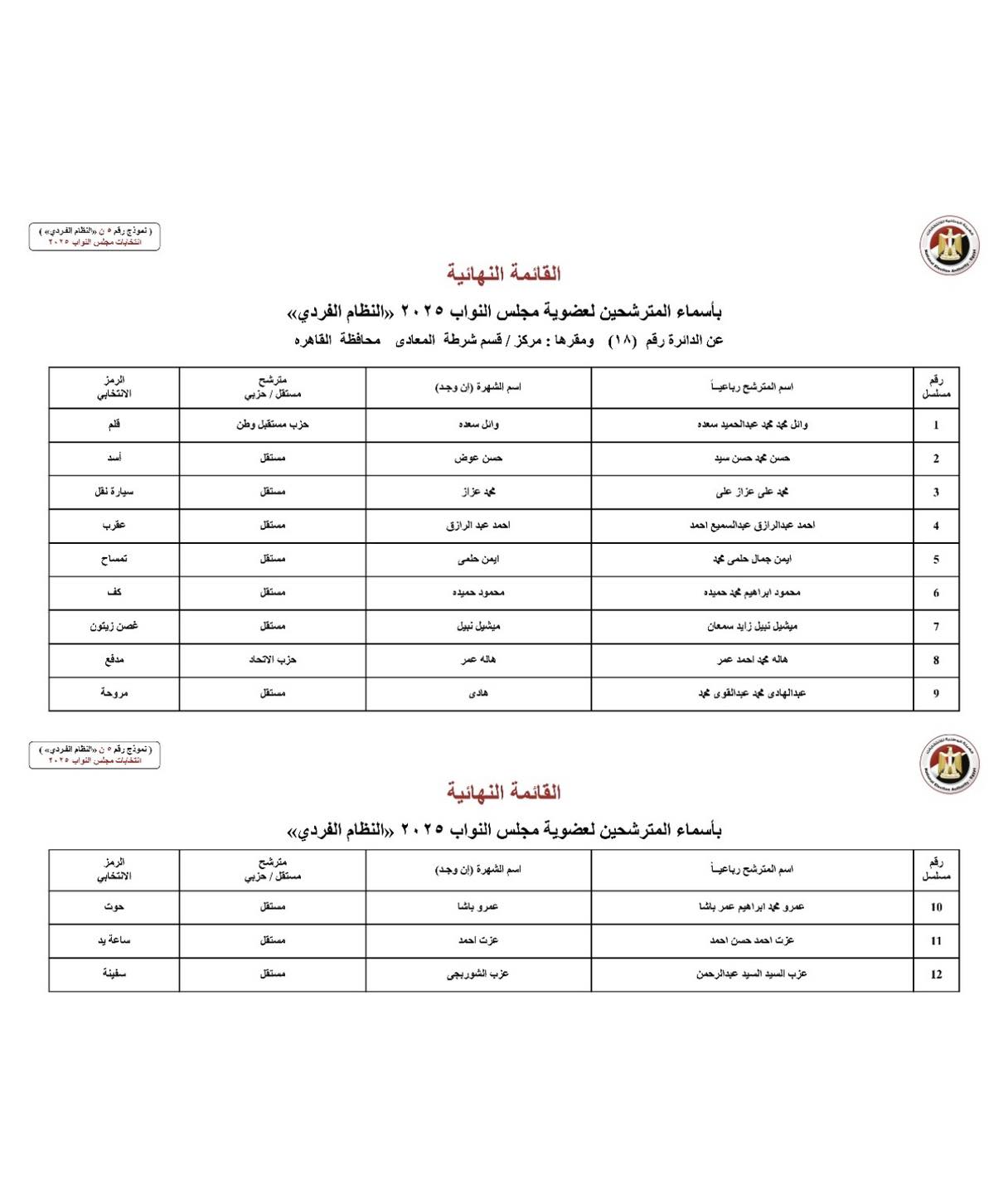 وجاء قرار الهيئة الوطنية للانتخابات برئاسة المستشار حازم بدوي، بإعلان القائمة النهائية للمرشحين، في ضوء انتهاء المدة القانونية المحددة لتقديم الطعون الانتخابية والفصل فيها أمام قضاء مجلس الدولة، سواء الطعون من جانب راغبي الترشح الذين استُبعدوا بمعرفة لجان تلقي وفحص طلبات الترشح، أو من الطاعنين على أسماء بعض المترشحين الواردة أسماؤهم في كشوف القائمة المبدئية.