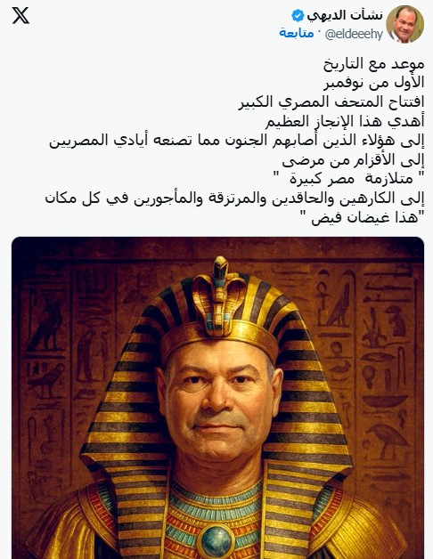 فقال الإعلامي نشأت الديهي، عبر حسابه على منصة "إكس"، إن افتتاح المتحف "موعد مع التاريخ".