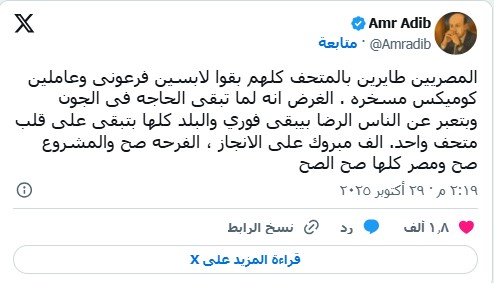 وأشار الإعلامي المصري عمرو أديب، عبر حسابه على منصة «إكس» إلى فرحة المصريين بالافتتاح، وقال: «المصريون طايرين بالمتحف كلهم لابسين فرعوني».