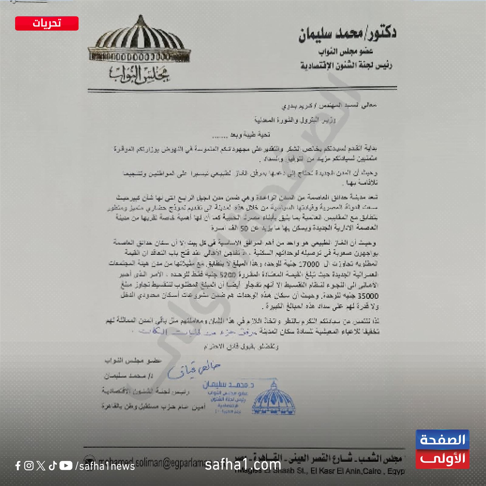 كما قدم النائب الدكتور محمد سليمان، رئيس لجنة الشؤون الاقتصادية في مجلس النواب، أمين عام حزب مستقبل وطن بالقاهرة، طلبا إلى المهندس كريم بدوي، وزير البترول والثروة المعدنية، حول شكوى حوالي 50 ألف أسرة من سكان حدائق العاصمة من التكلفة الباهظة لتوصيل الغاز الطبيعي، والتي تجاوزت الـ 17 ألف جنيه للوحدة، علما بان باقي المدن يتم توصيل الغاز لوحداتها مقابل مبلغ لا يتخطى الـ 5200 جنيه للوحدة.