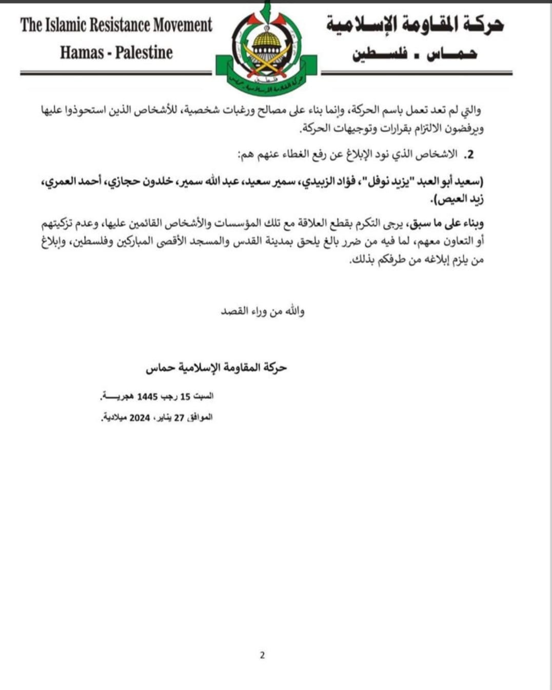 وفي يناير 2024 أصدرت حركة حماس بياناً رسمياً موجهاً إلى من يهمه الأمر، أعلنت فيه تبرؤها من ثلاث مؤسسات وهي «مؤسسة وقف الأمة»، «منبر الأقصى»، «كلنا مريم »، وكذلك مسئولى هذه المؤسسات؛ سعيد أبو العبد، وفؤاد الزبيدي، وعبدالله سمير، وخلدون حجازي، وأحمد العمري، وزيد العيص.